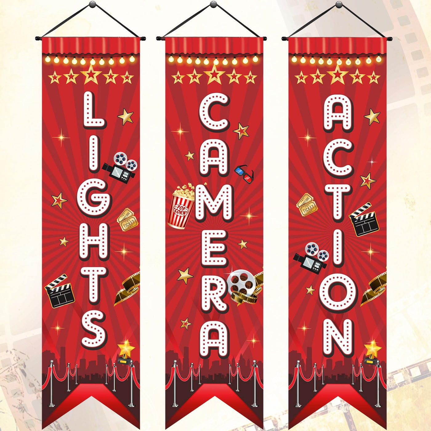 Tegeme Movie Night Porch Sign Banner Movie Theme Party Decorations Theater Welcome Now Showing Lights Camera Action Hanging Porc