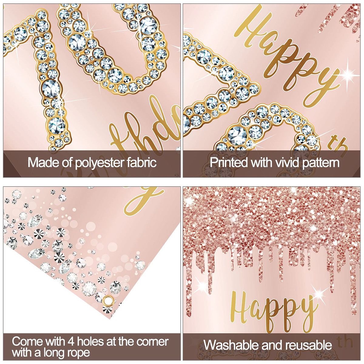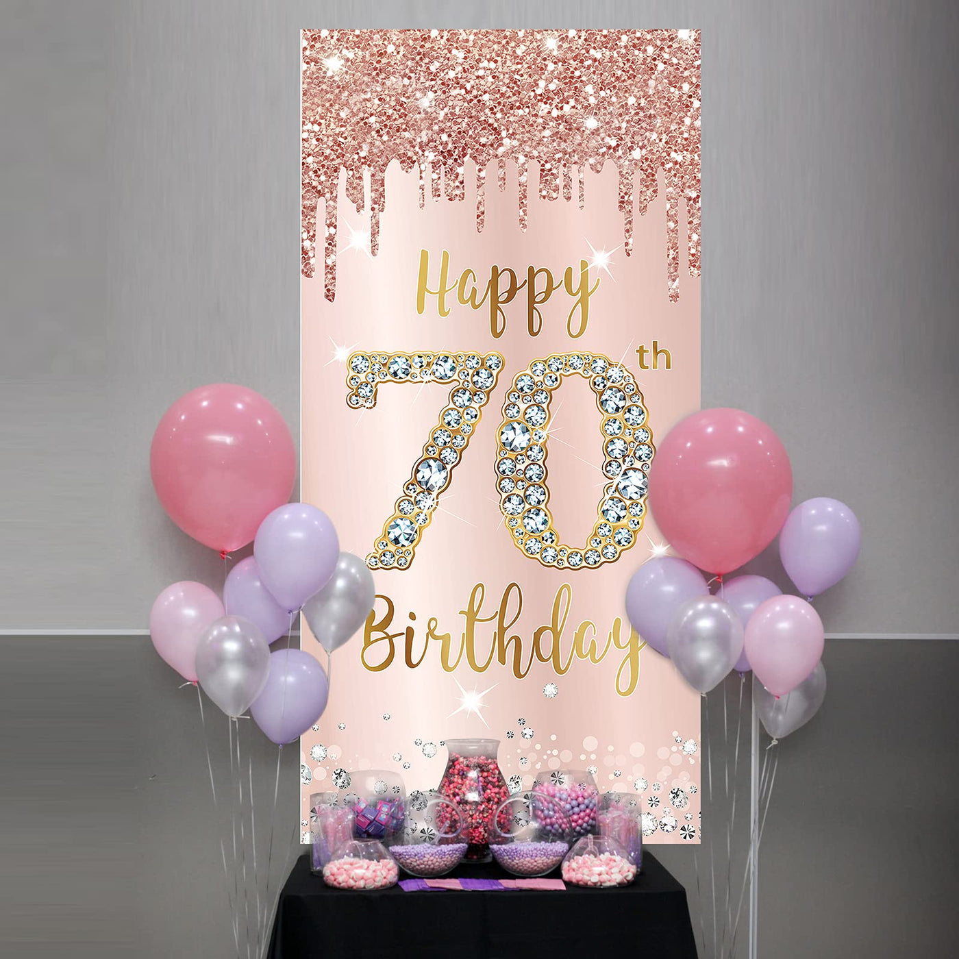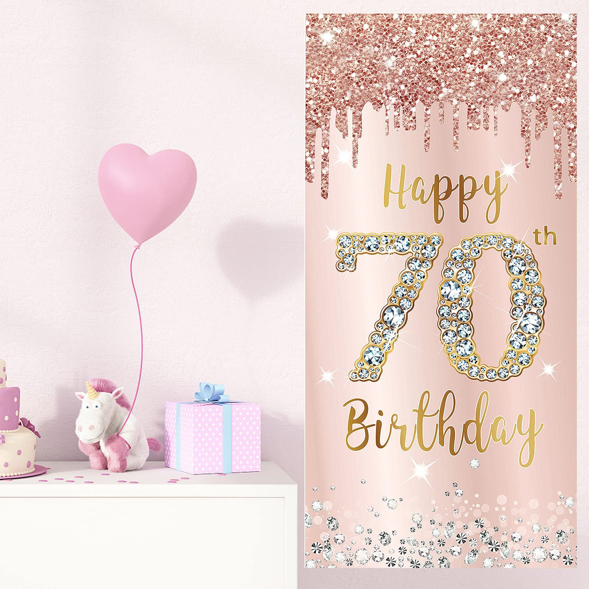 - Q: What is the design of the birthday banner? A: The banner features an elegant rose gold color scheme with the number '70' embellished with sparkling diamond elements, along with twinkling stars.
