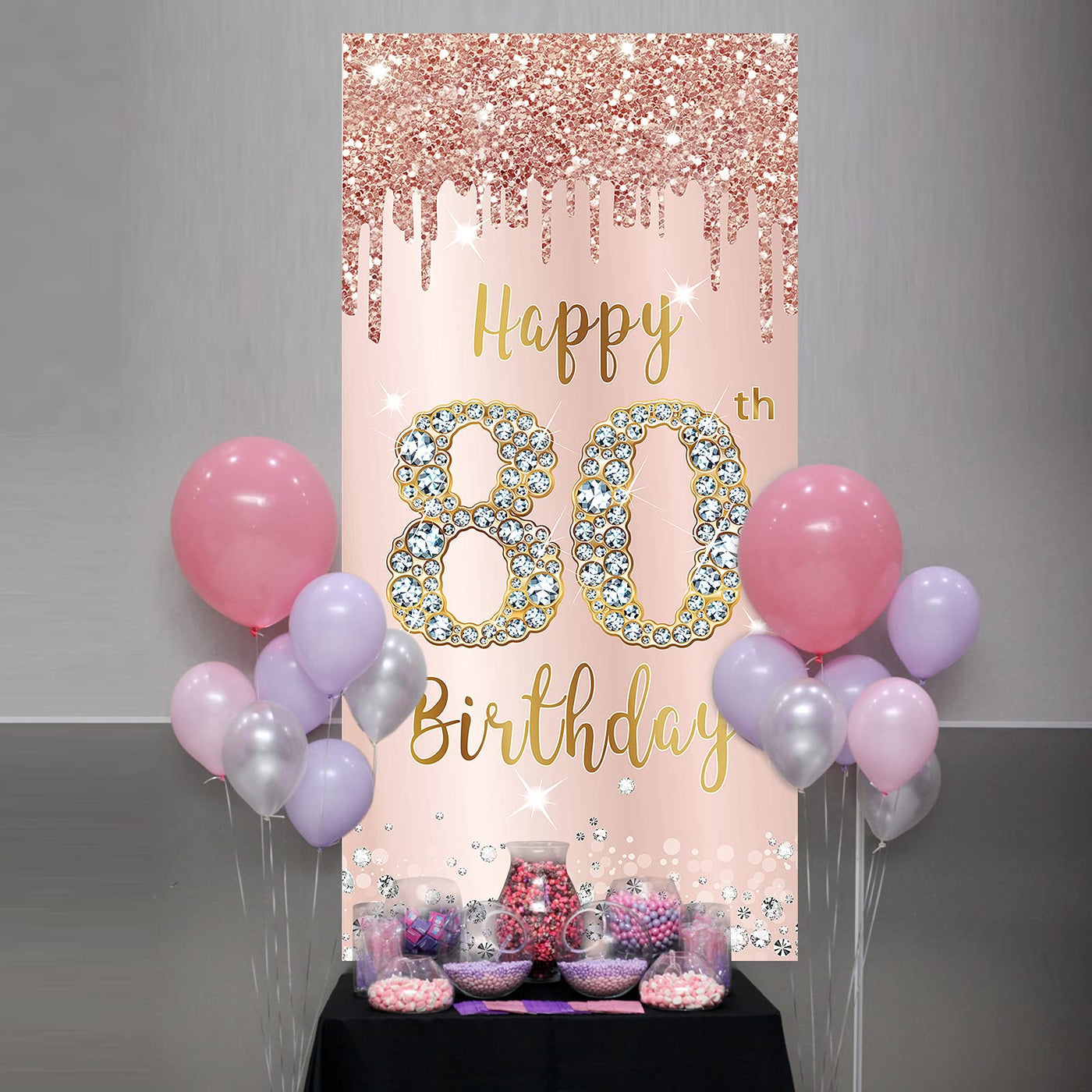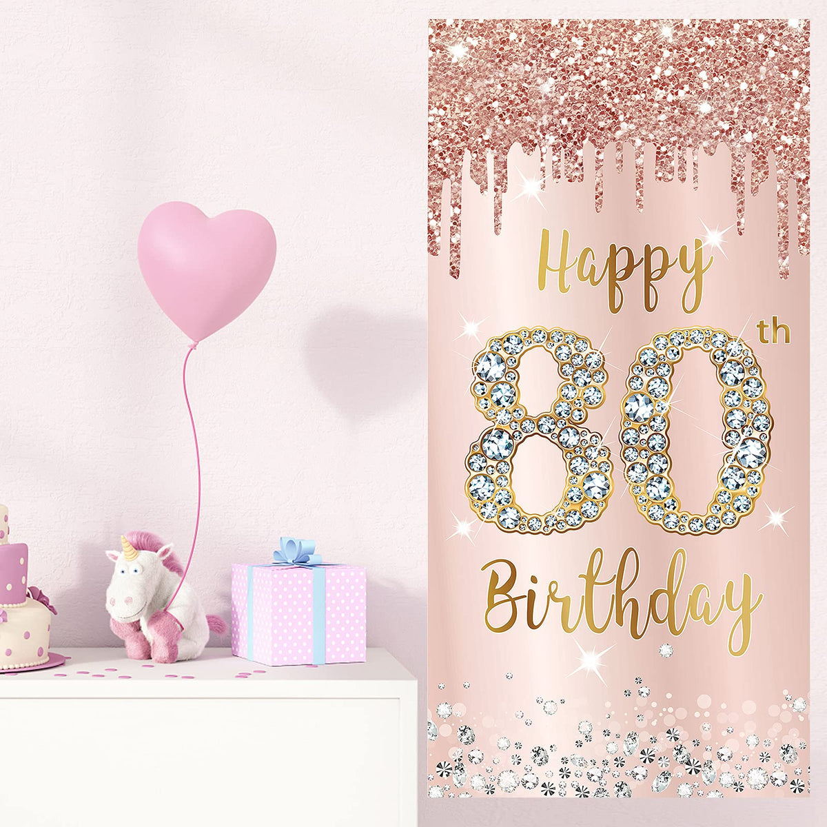 80Th Birthday Door Banner Decorations For Women, Pink Rose Gold Happy 80Th Birthday Door Cover Backdrop Party Supplies, Large 80