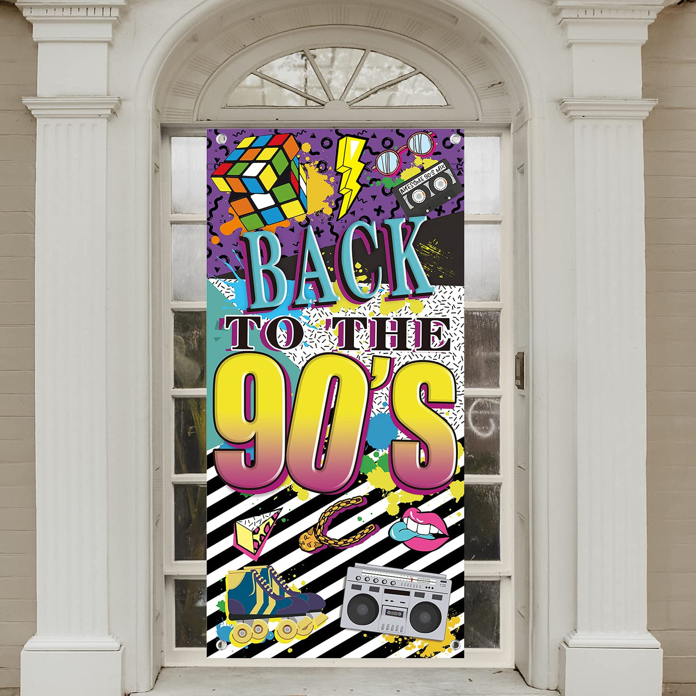• Q: Does the banner come with any additional items? A: Yes, the package includes one 90s themed party door cover banner and one ribbon for hanging.