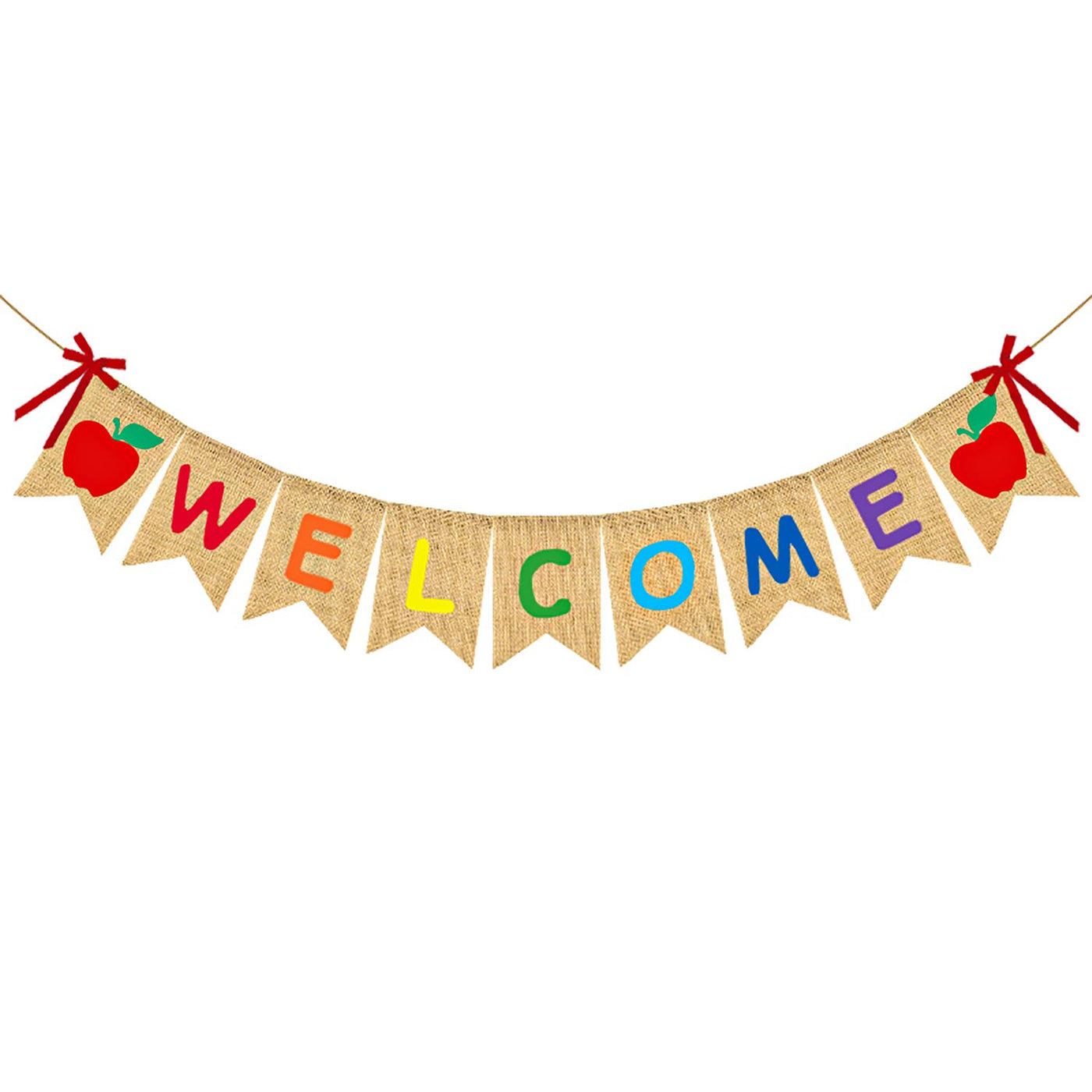 - Q: Does the banner have any specific design elements? A: The banner features colorful 'WELCOME' lettering with two adorable red apple patterns and is decorated with red bow ribbons for a festive touch.