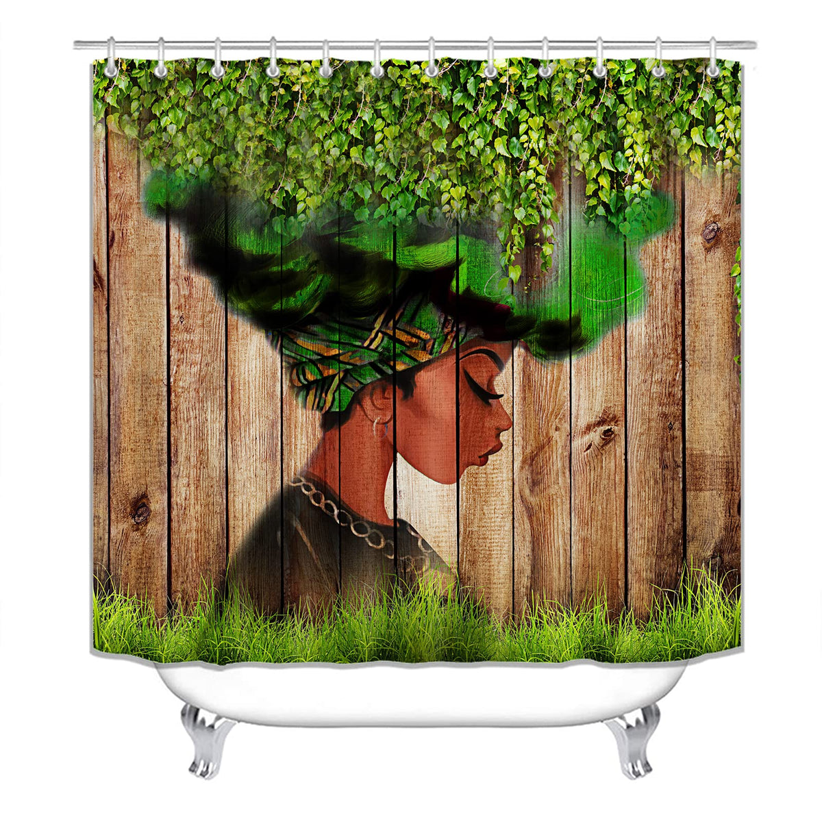 - Q: What type of design does the shower curtain feature? A: The shower curtain features a trendy design with vibrant colors and a clear image of an African woman with green leaves.