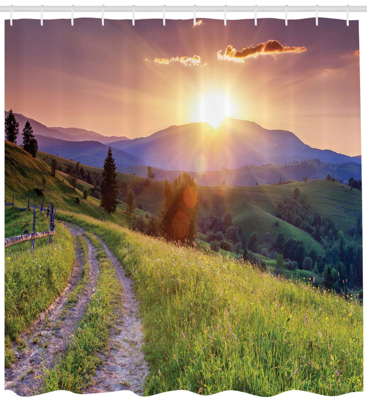 Ambesonne Landscape Shower Curtain, Sunset In The Mountain Landscape Rural Road Forest Countryside Wonderland Print, Cloth Fabri