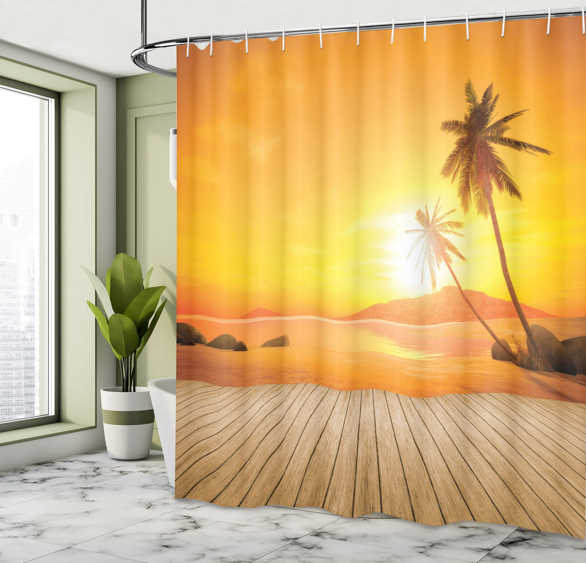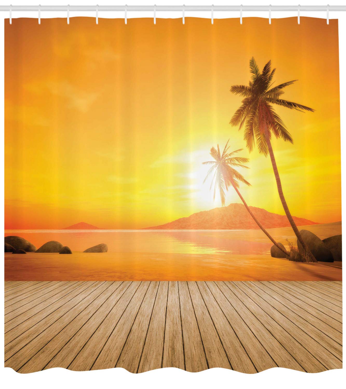 Ambesonne Ocean Shower Curtain, Sunset Over The Ocean With Palm Tree And Wooden Deck Horizon View Image Tropical, Cloth Fabric B