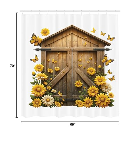 Ambesonne Rustic Shower Curtain, Farmhouse Lover Countryside Wooden Barn Cottage Summer Flowers Butterfly, Cloth Fabric Bathroom
