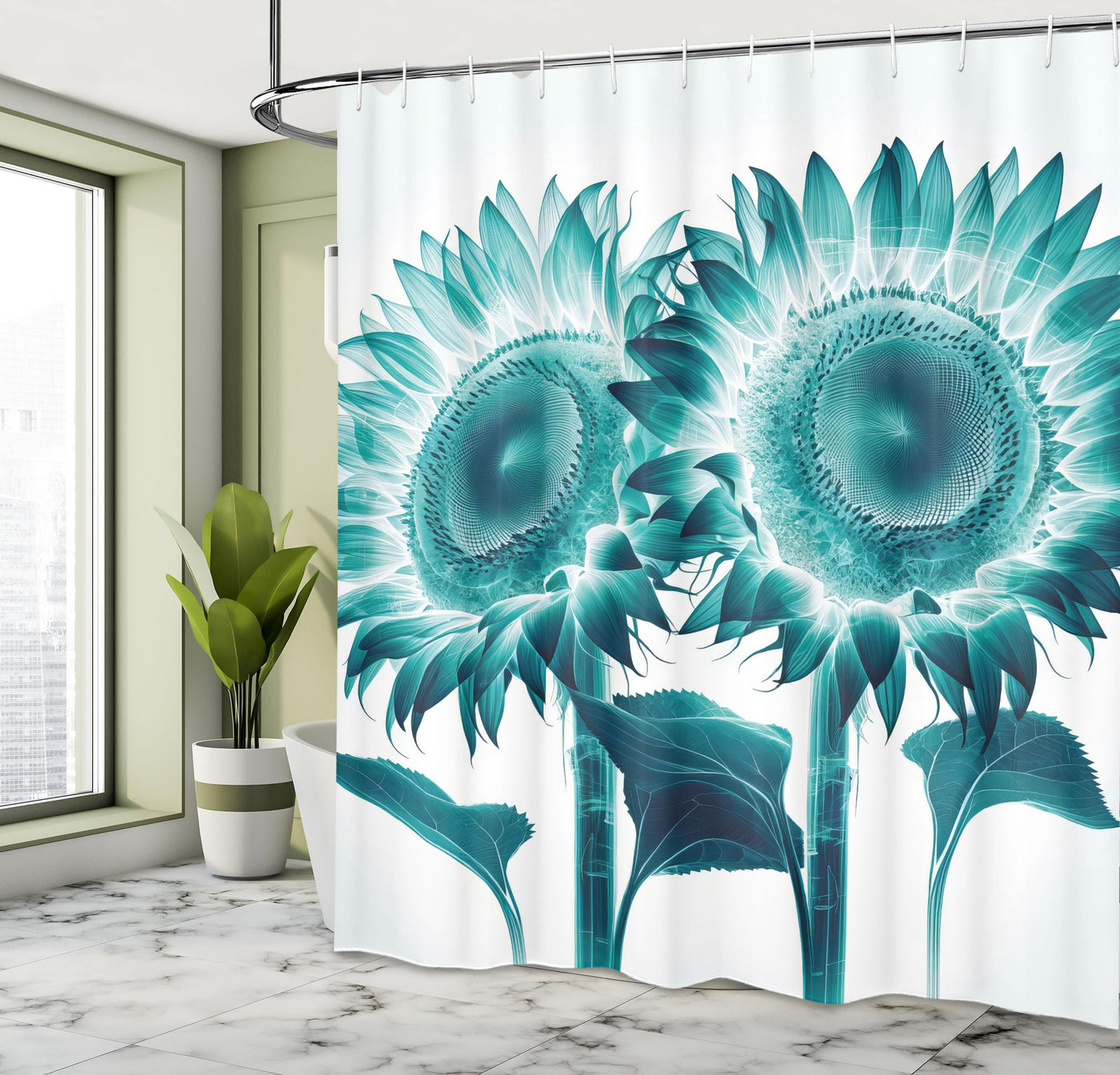 - Q: What colors and designs are available for this shower curtain? A: The shower curtain features a futurist sunflowers illustration with dreamy cyberworld colors, primarily in seafoam petrol blue and white.
