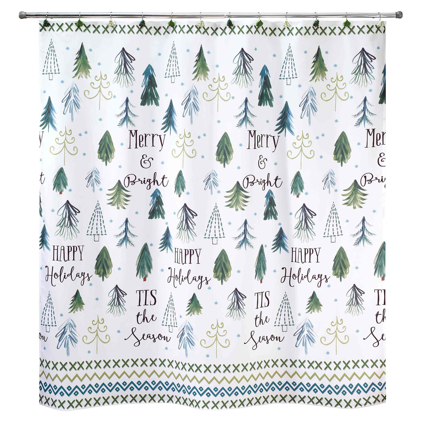 - Q: What is the design of the shower curtain? A: The shower curtain features whimsical trees and a holiday saying printed on an off-white ground.