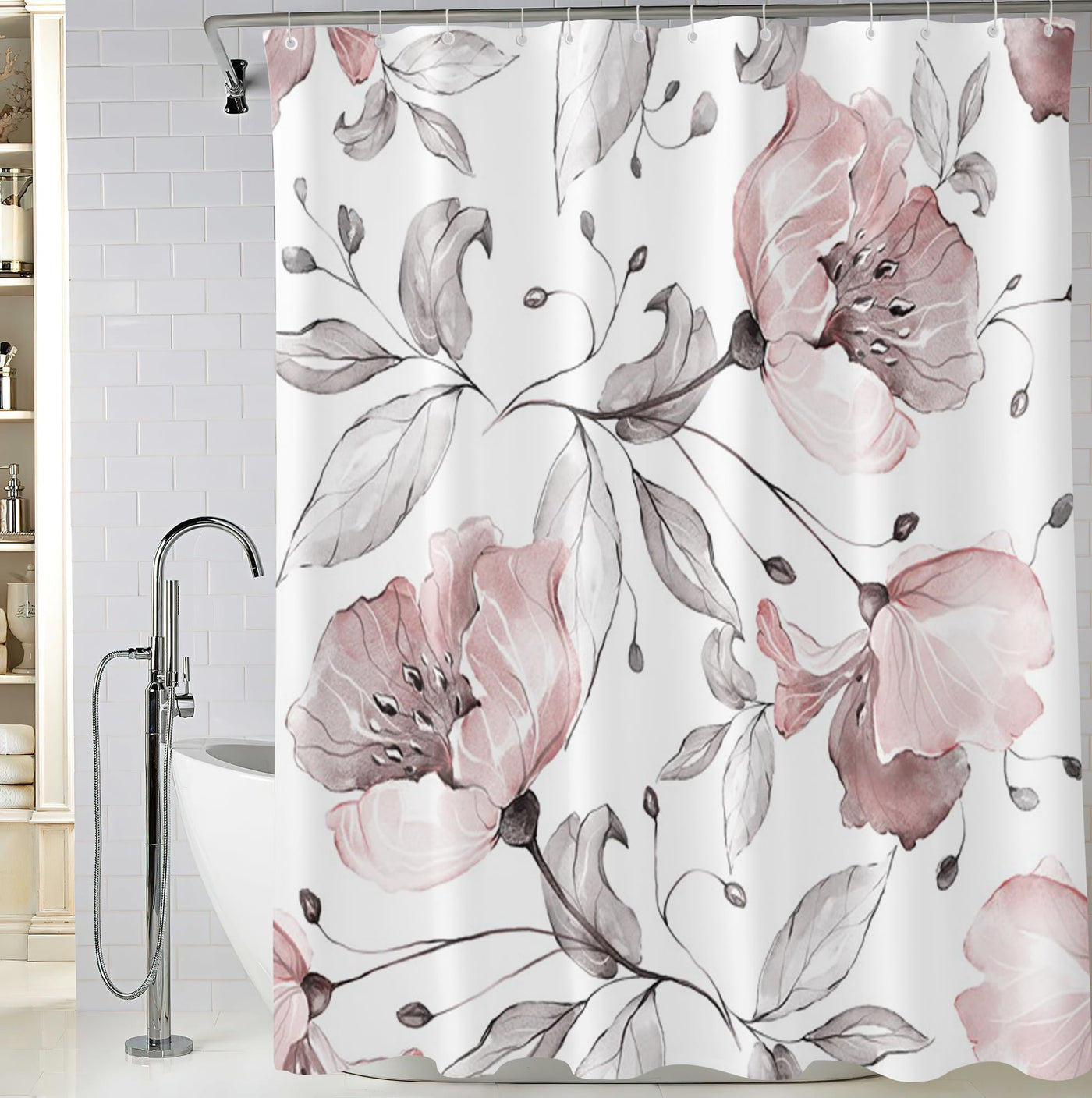 Bivinar Pink Floral Shower Curtain, Watercolor Flower Bathroom Shower Curtain, Fabric Waterproof Shower Curtain With 12 Hooks, 7