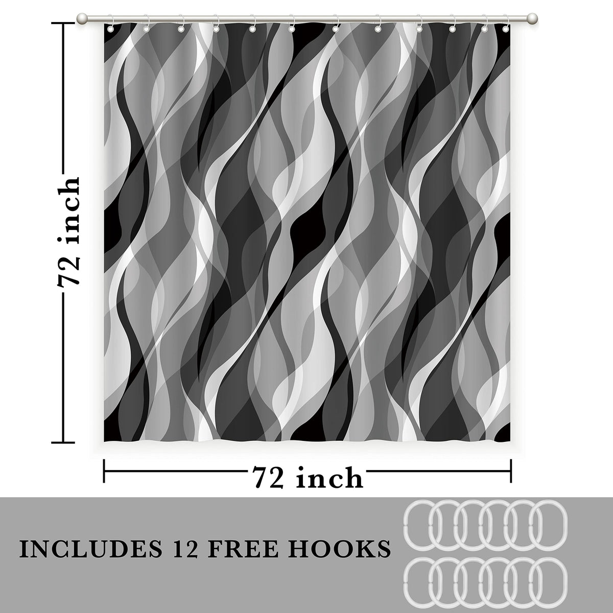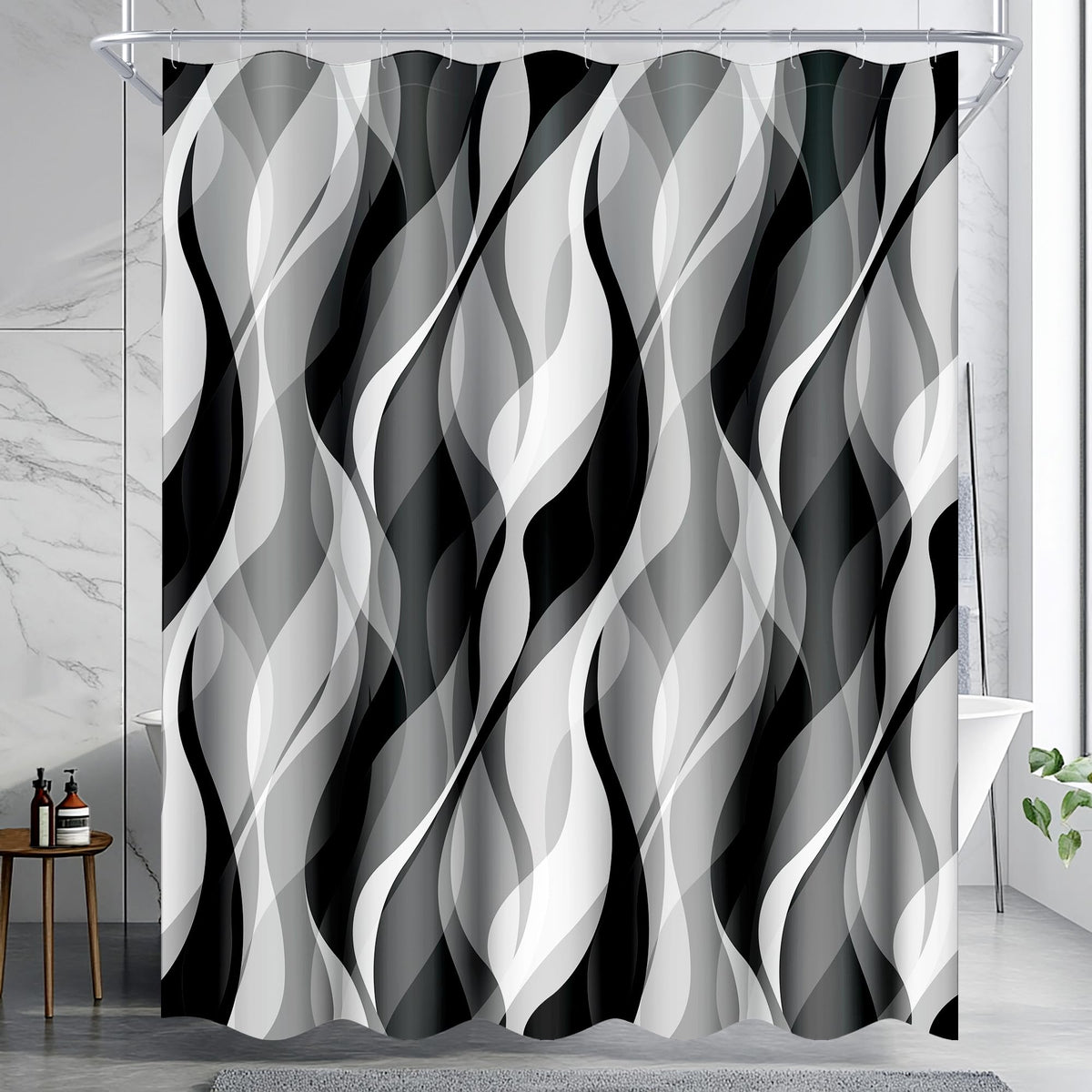 - Q: What design does the shower curtain feature? A: The shower curtain features a modern abstract striped design in white and gray, adding charm and sophistication to your bathroom.