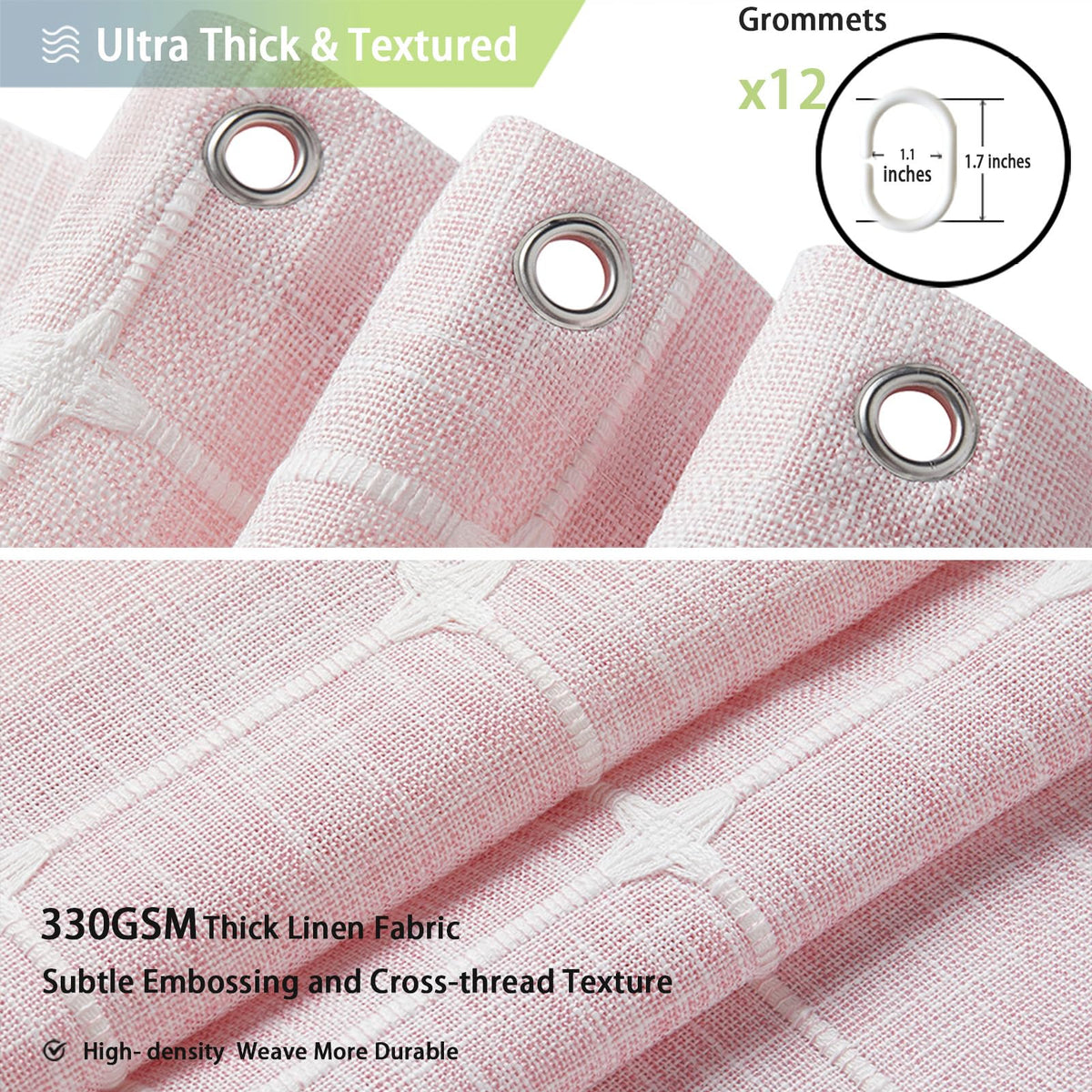 - Q: What material is the shower curtain made of? A: The shower curtain is made of a premium linen blend woven fabric that is ultra-thick, durable, and wrinkle-free, providing a soft feel.