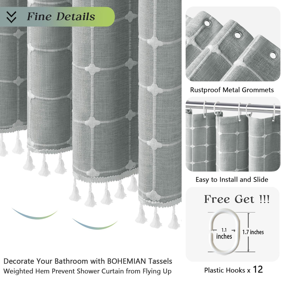 • Q: Is the design suitable for a modern bathroom? A: Yes, the curtain features a 3D embroidered plaid design with tassels, combining bohemian and farmhouse styles, making it a chic addition to modern bathrooms.