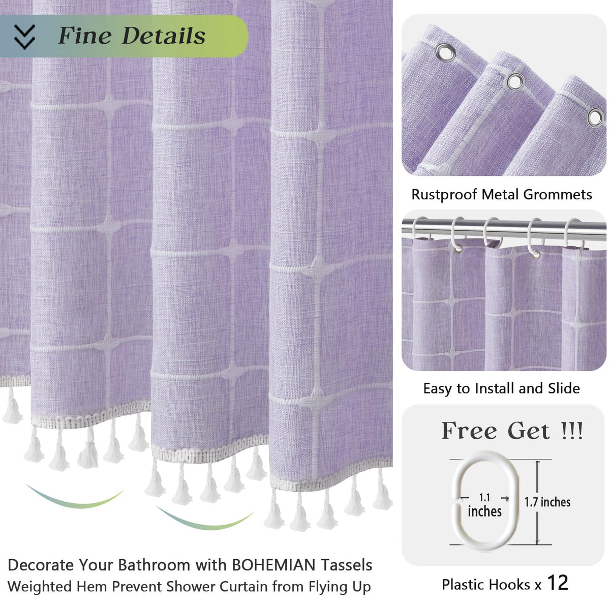 • Q: What styles does this shower curtain feature? A: The shower curtain combines a bohemian and farmhouse style, featuring a 3D embroidered plaid design with tassels on three sides, adding an elegant touch to your bathroom.