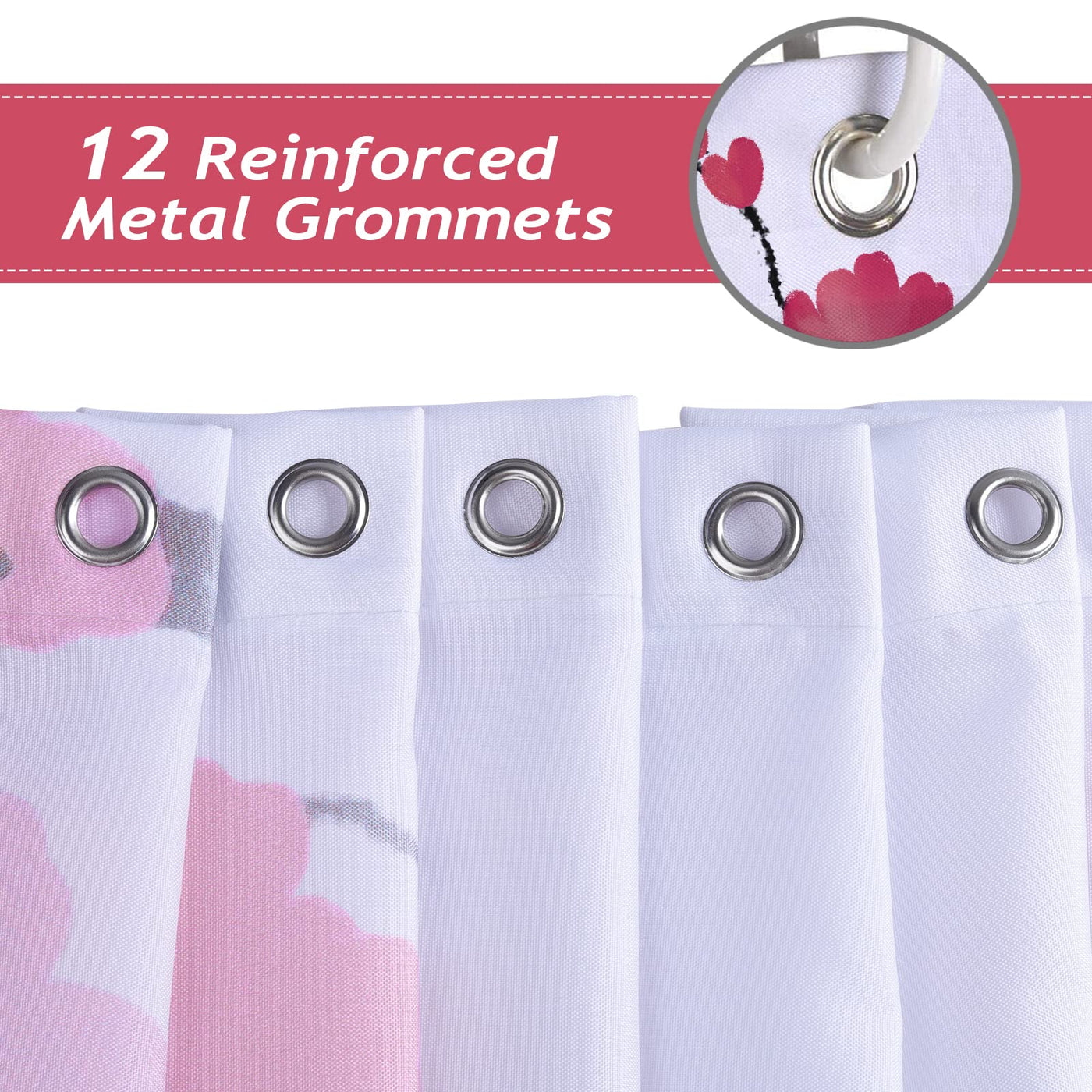 - Q: What design does the shower curtain feature? A: The shower curtain features a vivid cherry blossom watercolor design that adds a fresh and elegant look to your bathroom.