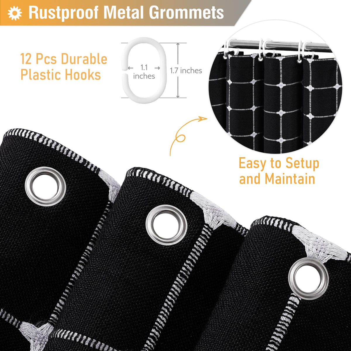 - Q: What style does this shower curtain feature? A: The shower curtain features a boho farmhouse style with a 3D embroidery plaid design and elegant tassels, adding a touch of luxury to your bathroom.