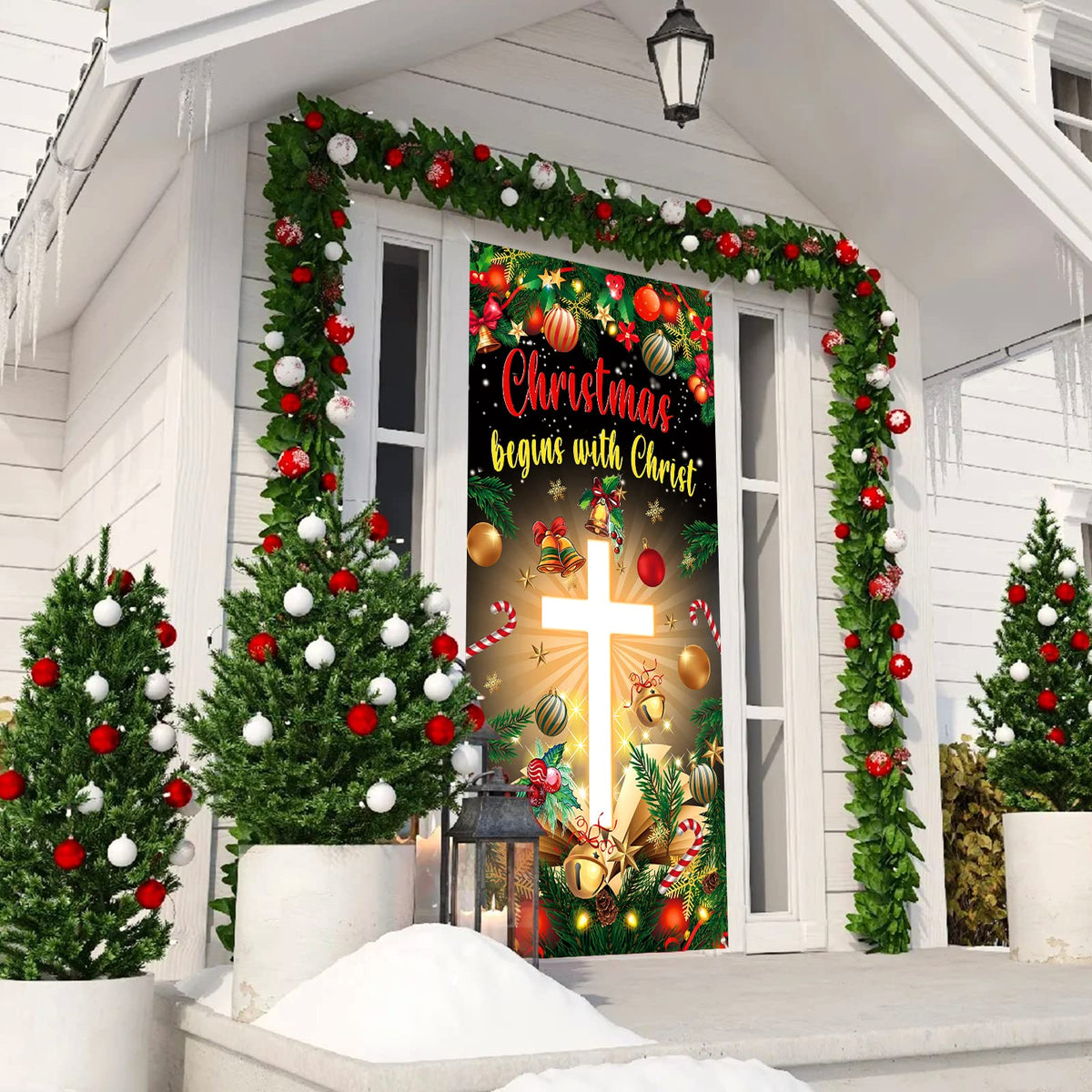 Christmas Cross Door Cover Nativity Cross Religious Door Decorations Banner Christmas Begins With Christ Porch Sign Photo Backdr
