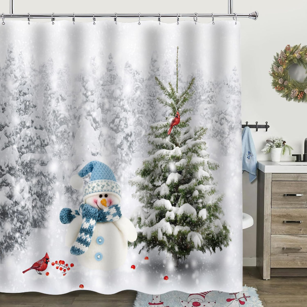 Cnayuep Christmas Shower Curtain, Winter Shower Curtain Set, Waterproof Cute Bathroom Shower Curtain Sets, Snowman Christmas Tre