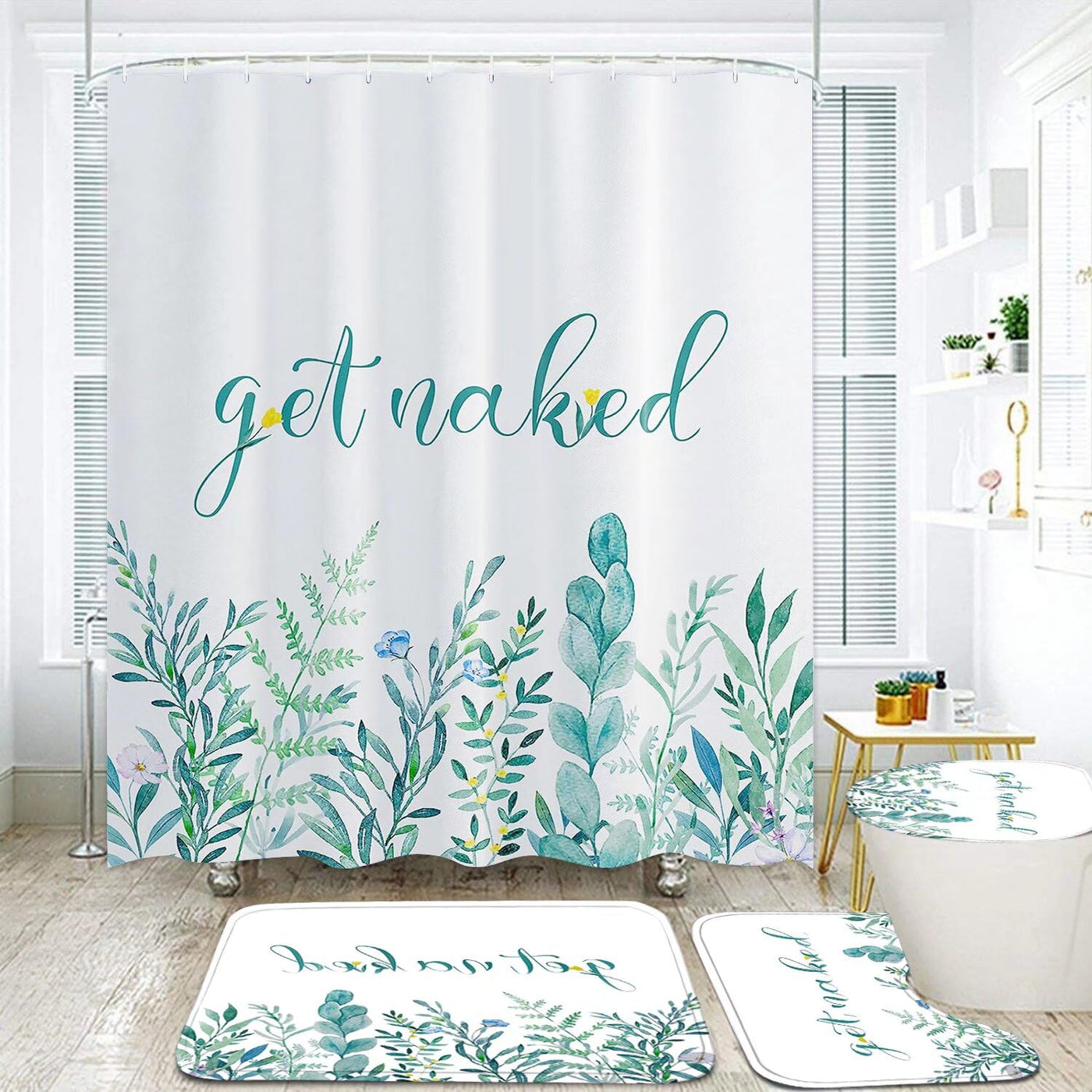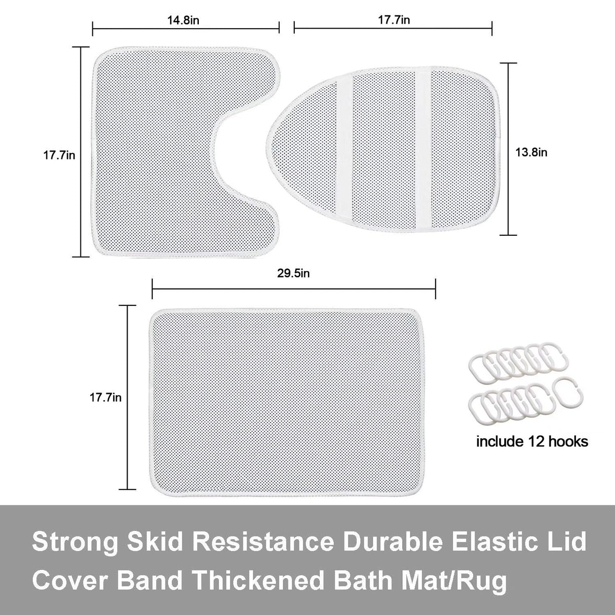 - Q: What are the dimensions of the shower curtain and mats in this set? A: The shower curtain measures 70.8 inches by 70.8 inches, the rectangle mat is 29.5 inches by 17.7 inches, the U shape mat is 14.8 inches by 17.7 inches, and the toilet lid cover mat is 13.8 inches by 17.7 inches.