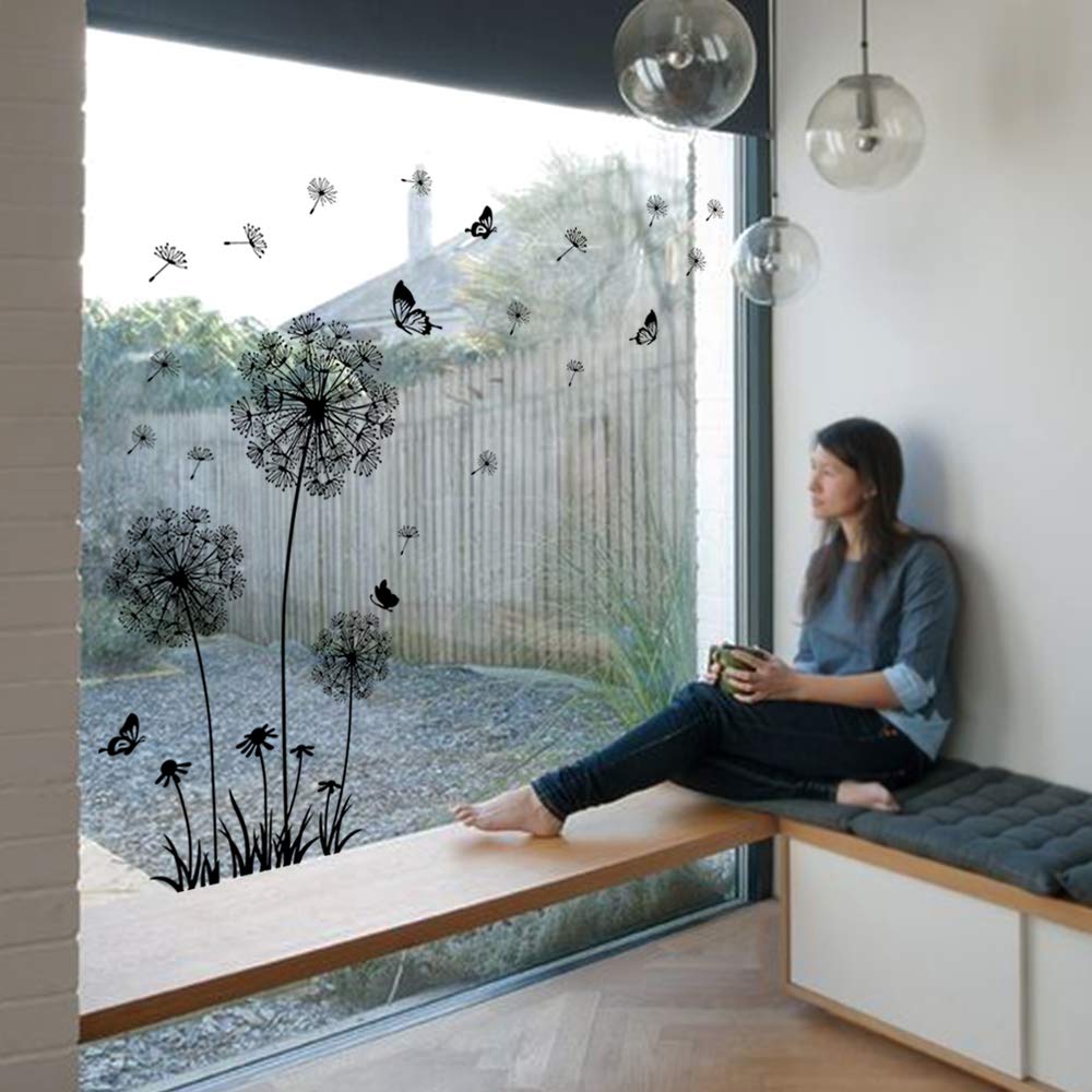 Decalmile Dandelion Wall Decals Flying Flowers Butterflies Wall Stickers Dandelion Wall Art Living Room Bedroom Decor (Black)