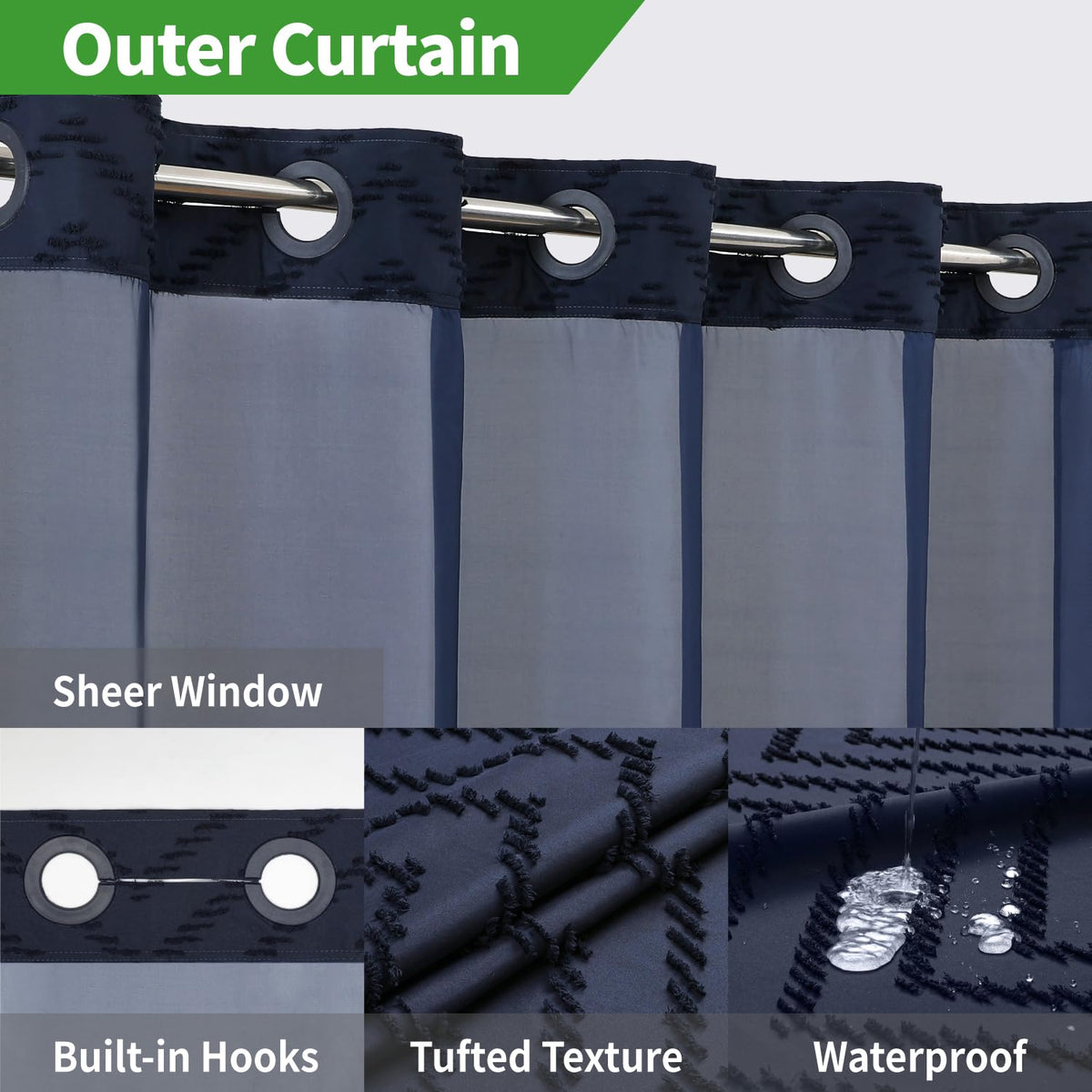 Eachope Long No Hook Tufted Chevron Striped Shower Curtain With Snap-In Fabric Liner Set-71Wx80H(78H),Navy Blue Hotel Grade Boho