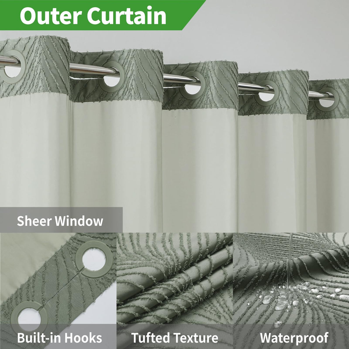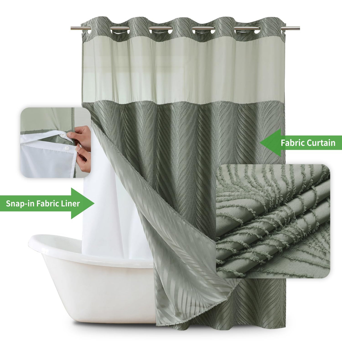 Eachope No Hook Shower Curtain And Liner Set,Boho Style With See Through Top Window, Sagegreen Fabric Tufted Striped Textured Ou