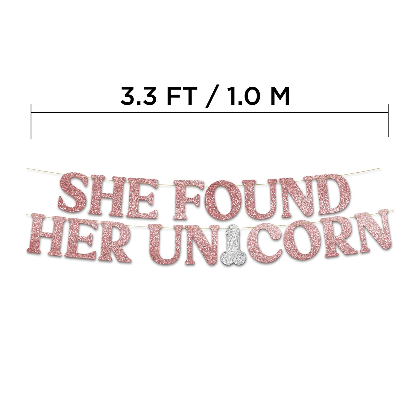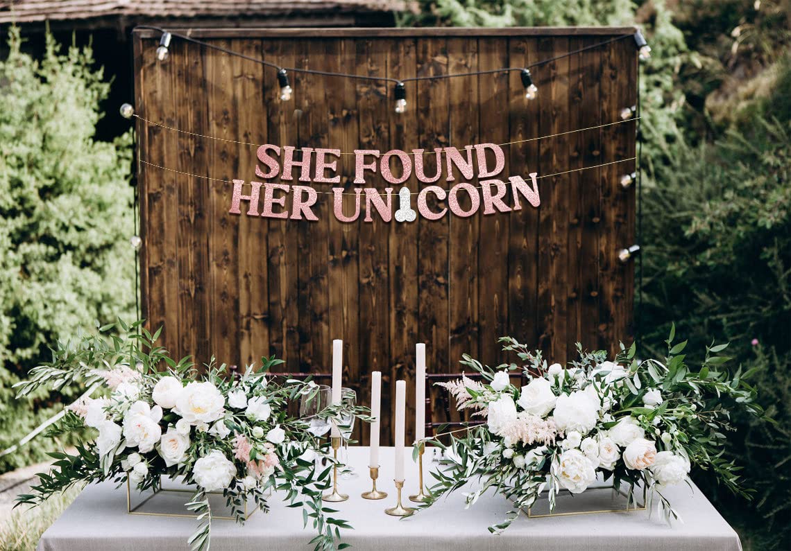 - Q: What is the design theme of the banner? A: The banner features a rose gold glitter design with the phrase 'She Found Her Unicorn,' perfect for bachelorette party themes.
