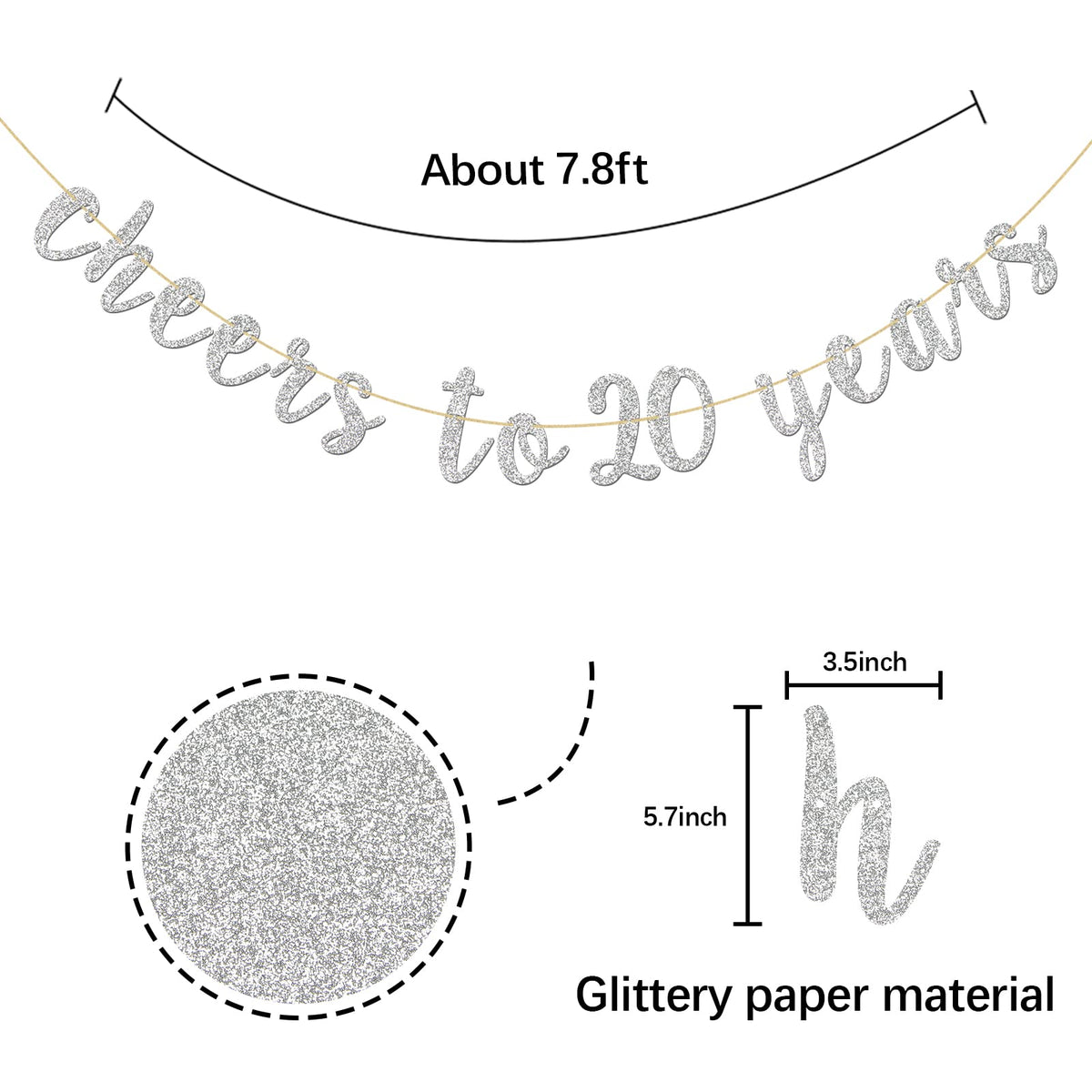 - Q: What is the Glitter Silver Cheers to 20 Years Banner made of? A: The banner is made of thick cardboard that features shiny silver glitter letters, providing a festive look for celebrations.
