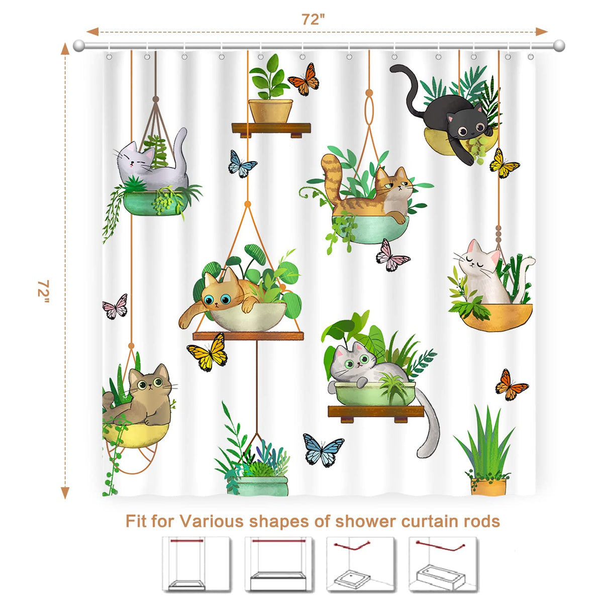 - Q: What are the dimensions of the Hanging Potted Plants Cat Shower Curtain? A: The shower curtain measures 72 inches in length and 72 inches in width, making it a standard size suitable for most bathtubs and shower stalls.