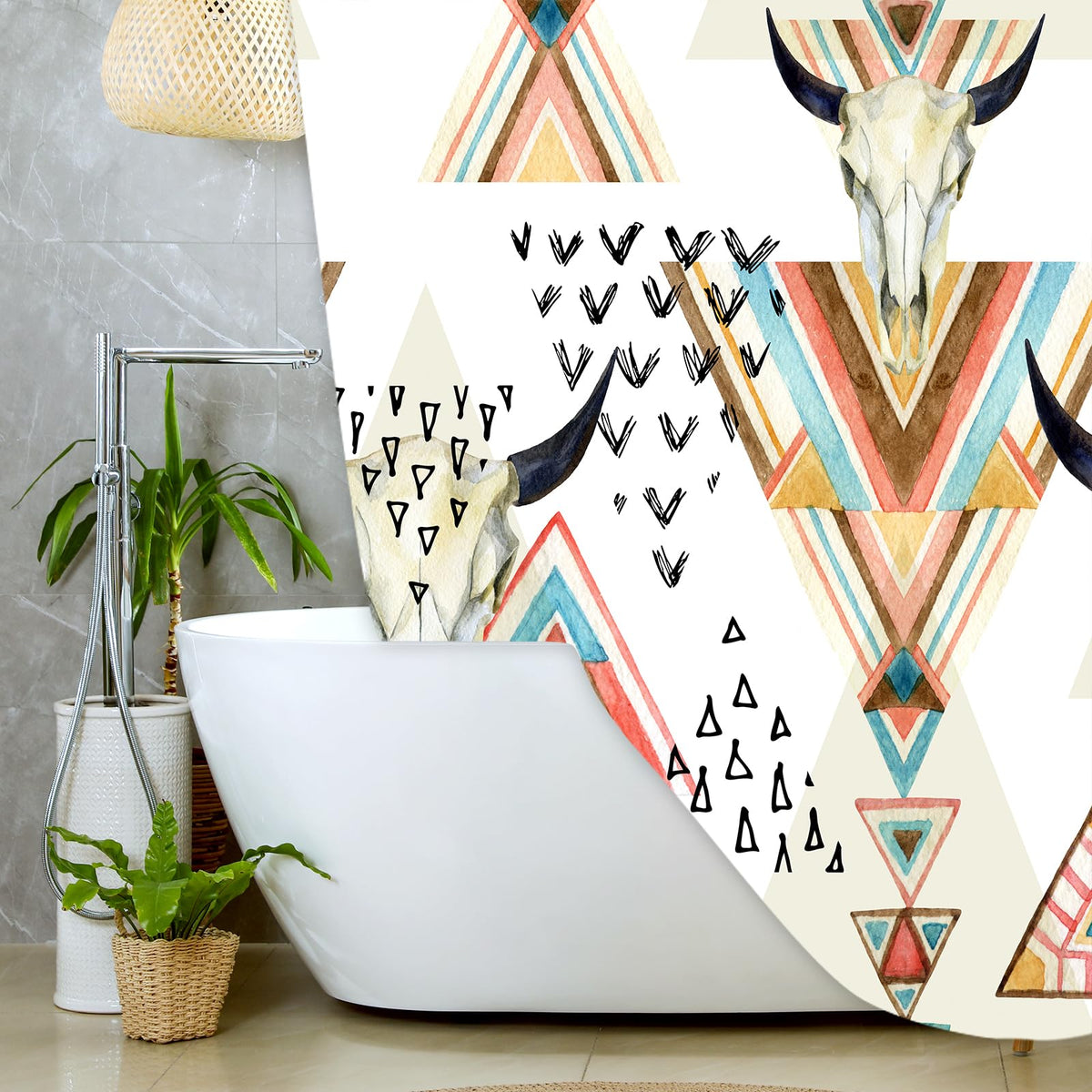 Jawo Western Boho Shower Curtain Native Aztec Tribal Bull Skull Southwestern Cow Bohemian Geometric Pattern West Bathroom Decor