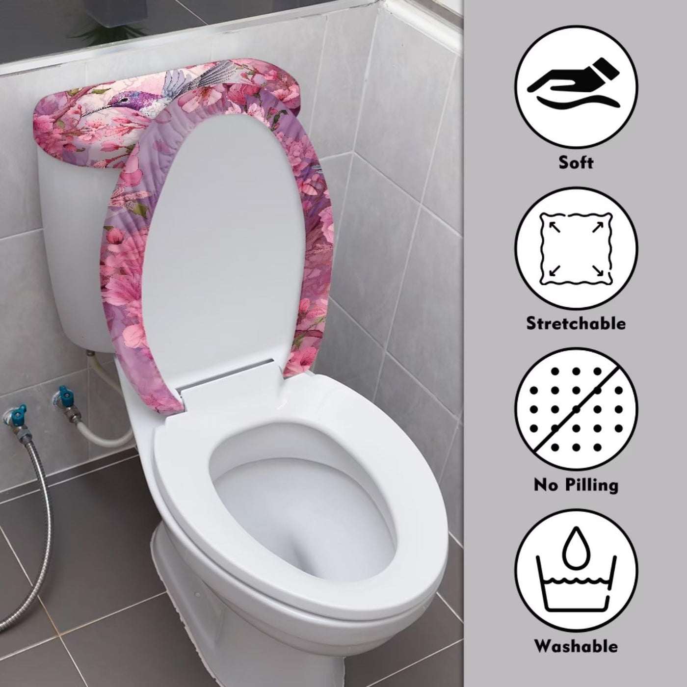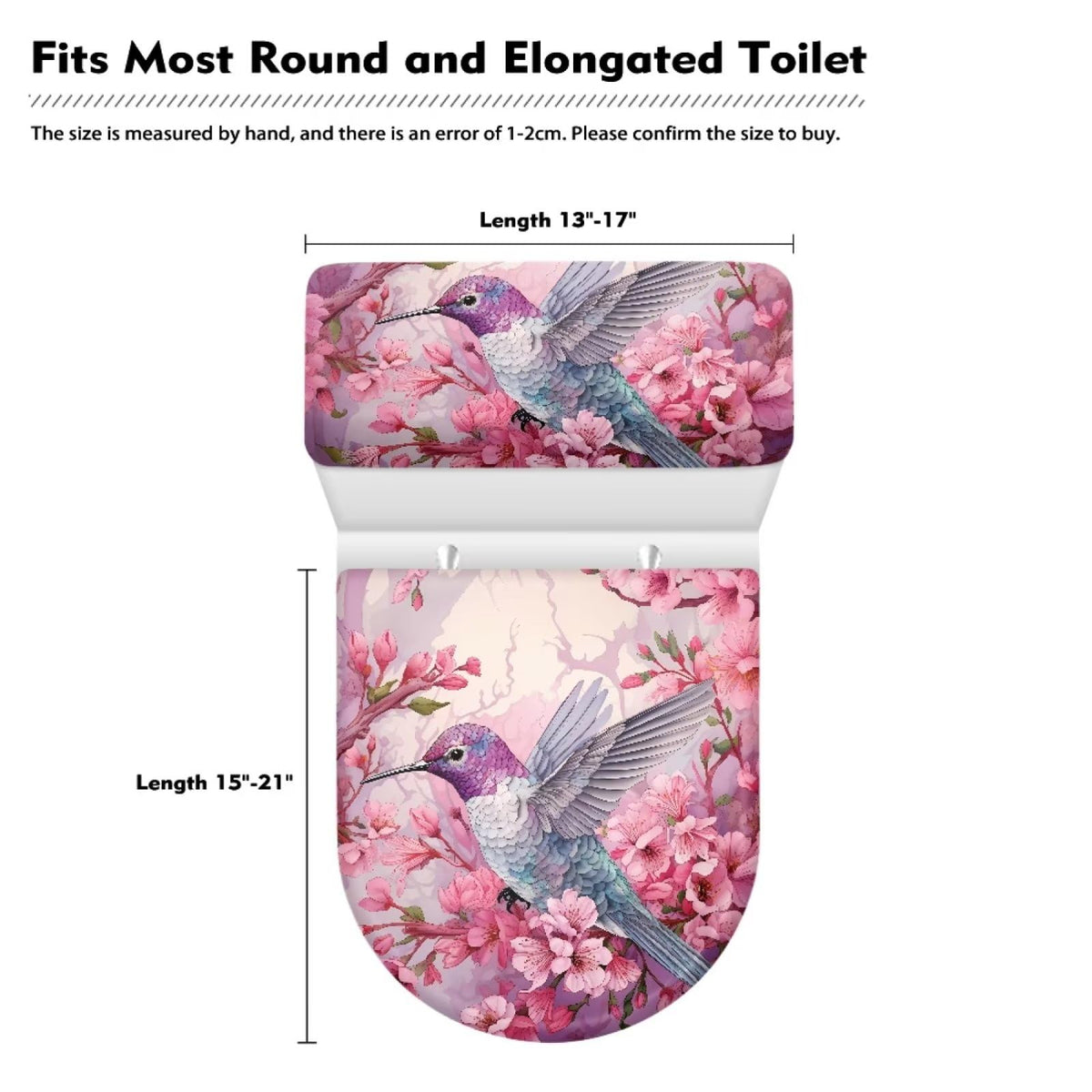 Kuiforti Pink Flowers Toilet Seat Lid Cover Set Of 2 Pcs,Hummingbird Floral Print Toilet Tank Lid Cover Toilet Mat Protective Co