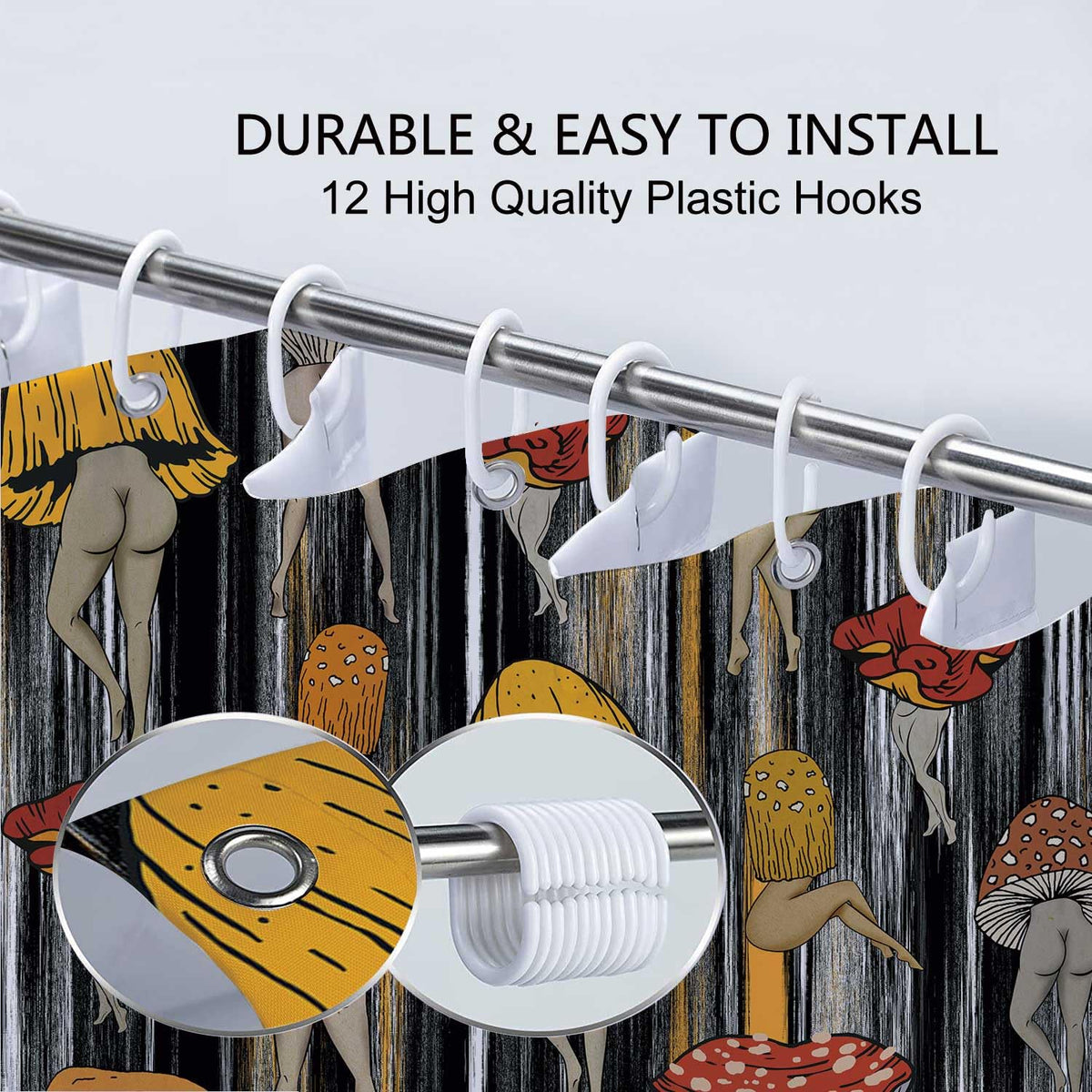 - Q: Does the shower curtain come with hooks for installation? A: Yes, the Funny Mushroom Shower Curtain includes 12 hooks for easy and quick installation.