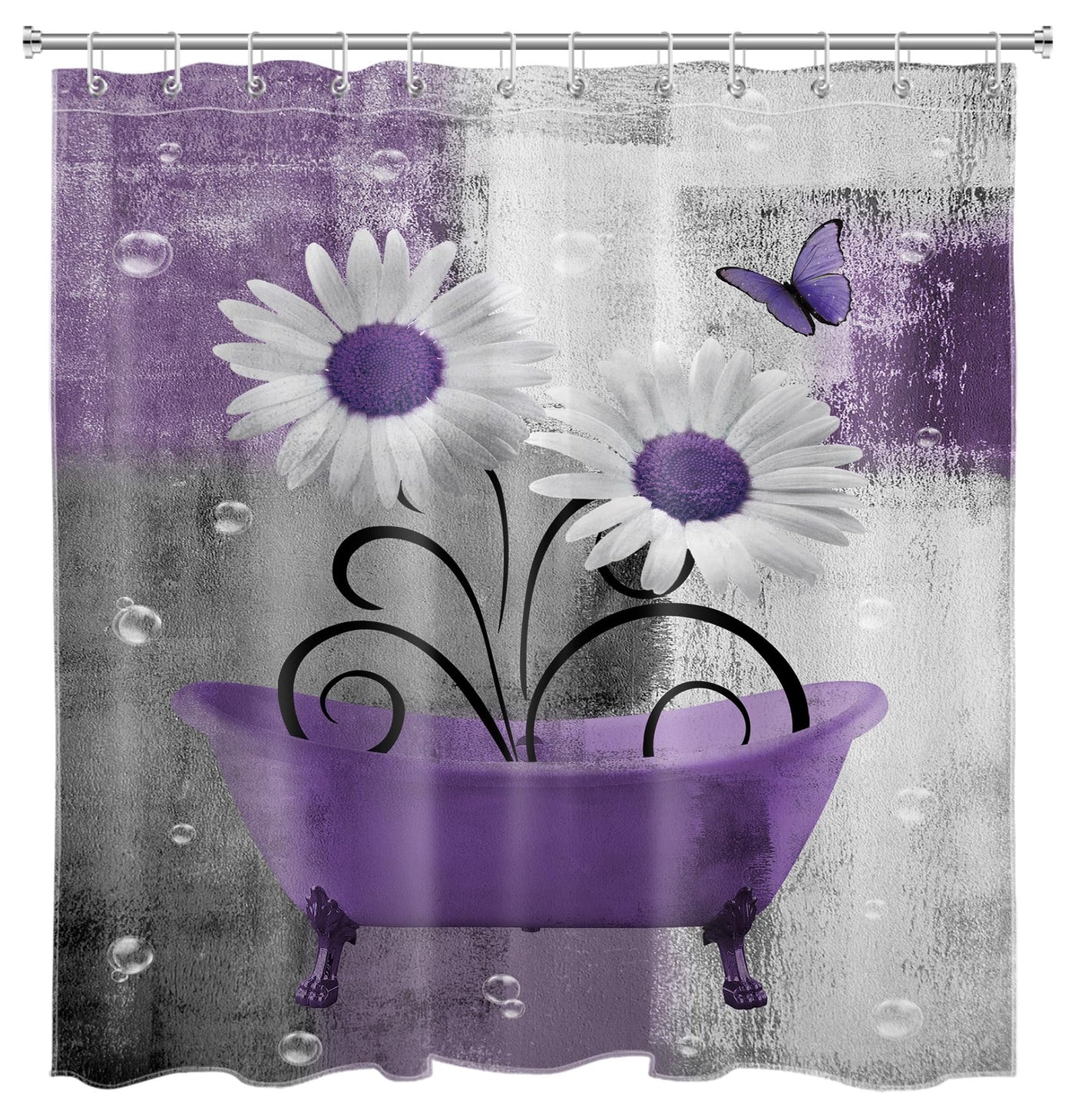 Meunear Purple Floral Shower Curtain Set Farmhouse Daisy Flower Butterfly In Bathtub Shower Curtain For Bathroom, Modern Abstrac