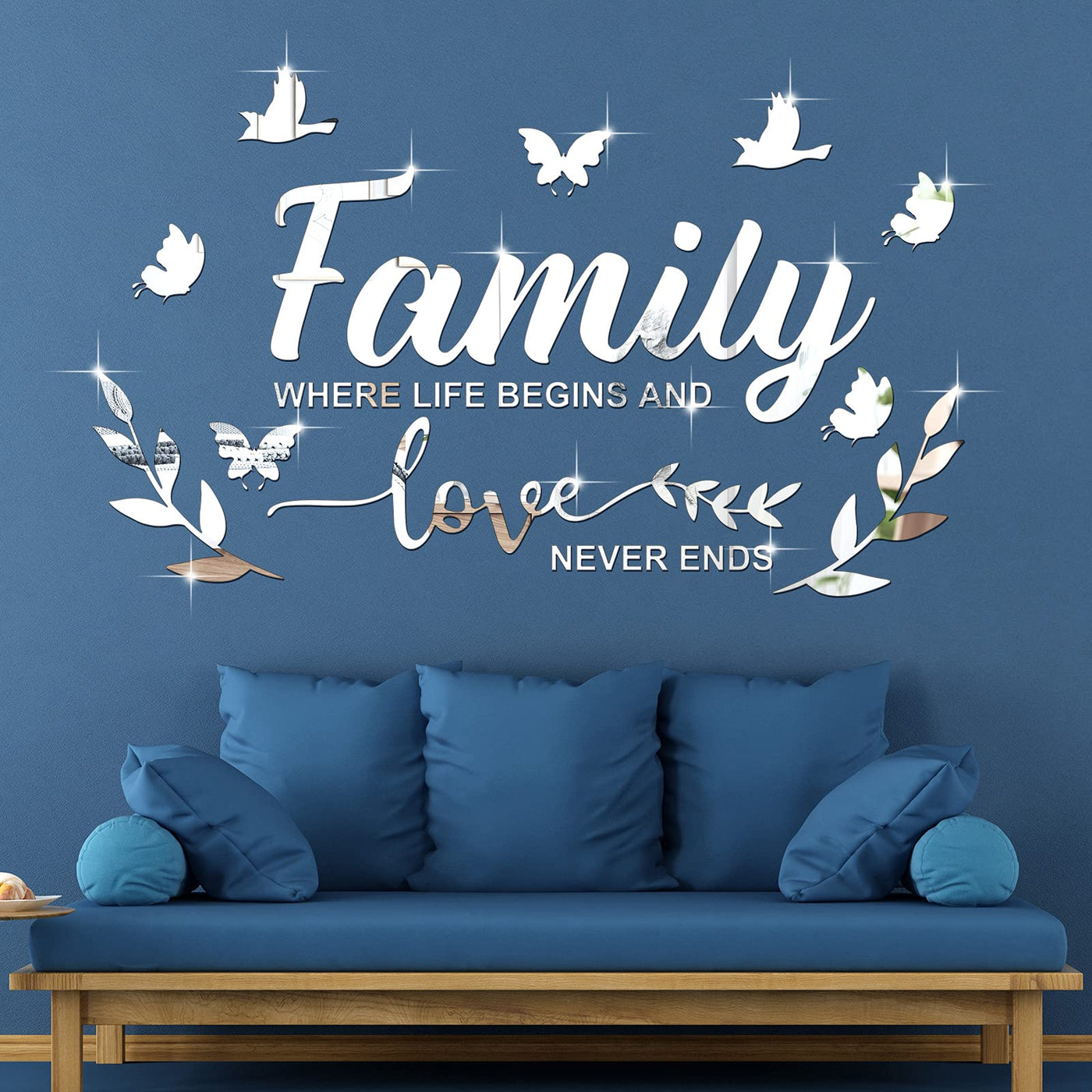 - Q: What is included in the package? A: The package includes one set of family wall mirror stickers, which features the phrase 'Family where life begins and love never ends,' along with butterfly and leaf mirror stickers.
