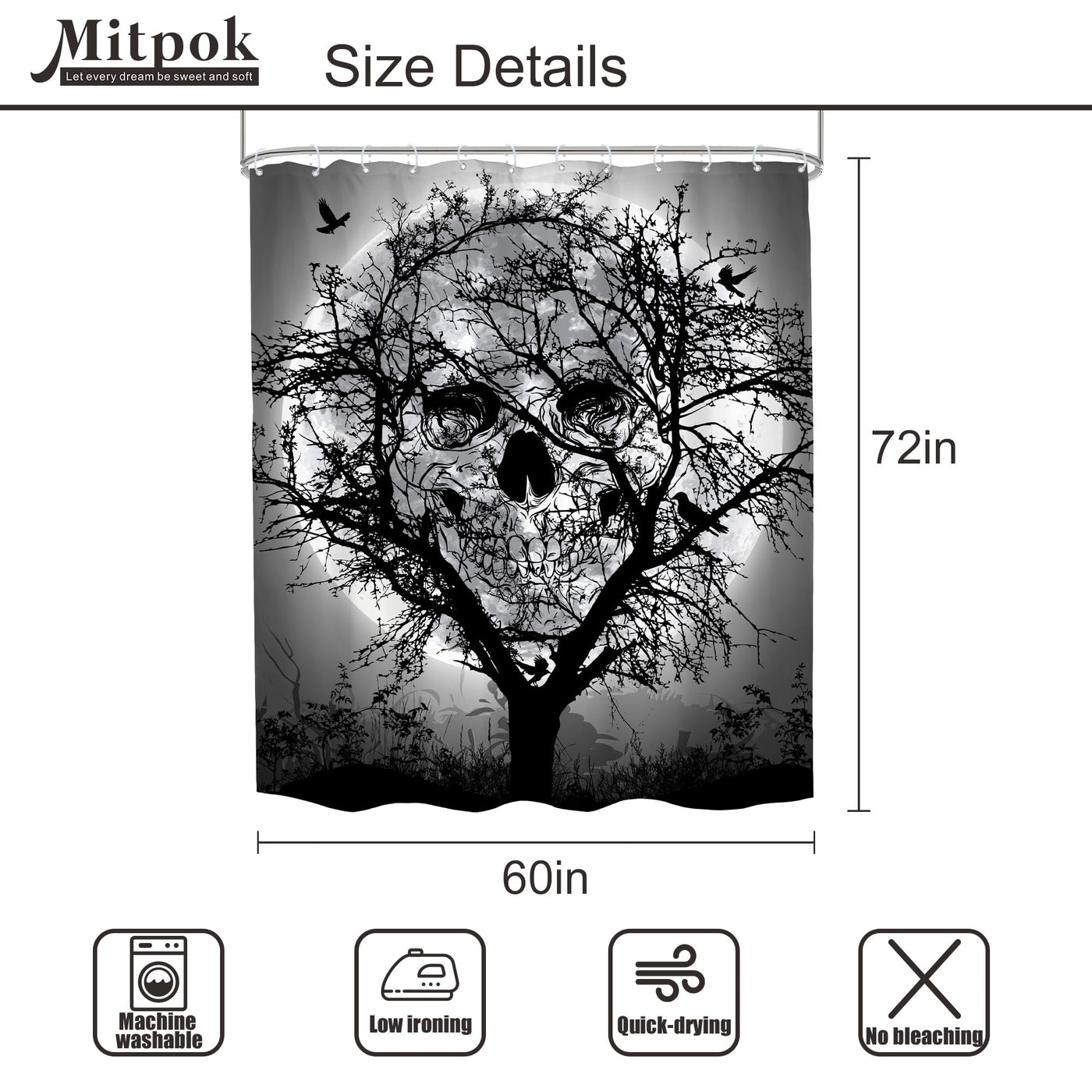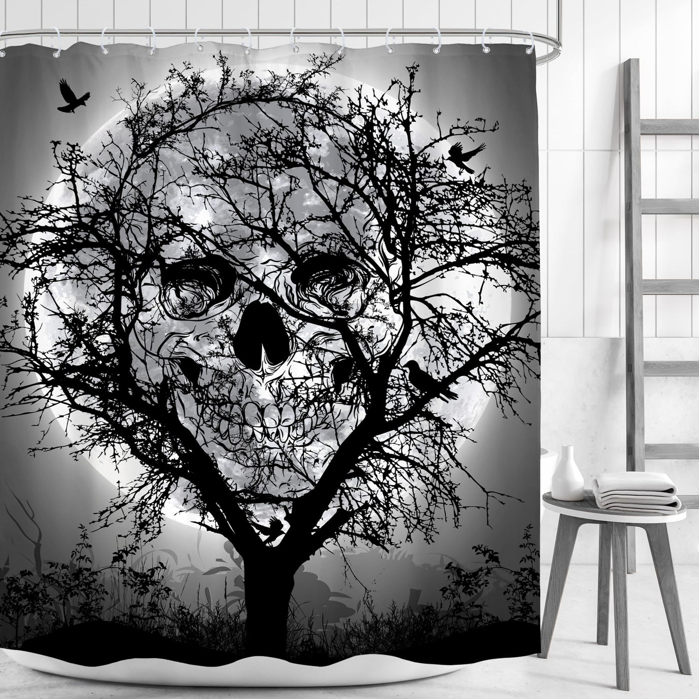 Mitpok Gothic Sugar Skull Shower Curtain 60Wx72H Spooky Skeleton Abstract Bone Cool Witchy Moon Scary Black Trees Bird Woodland
