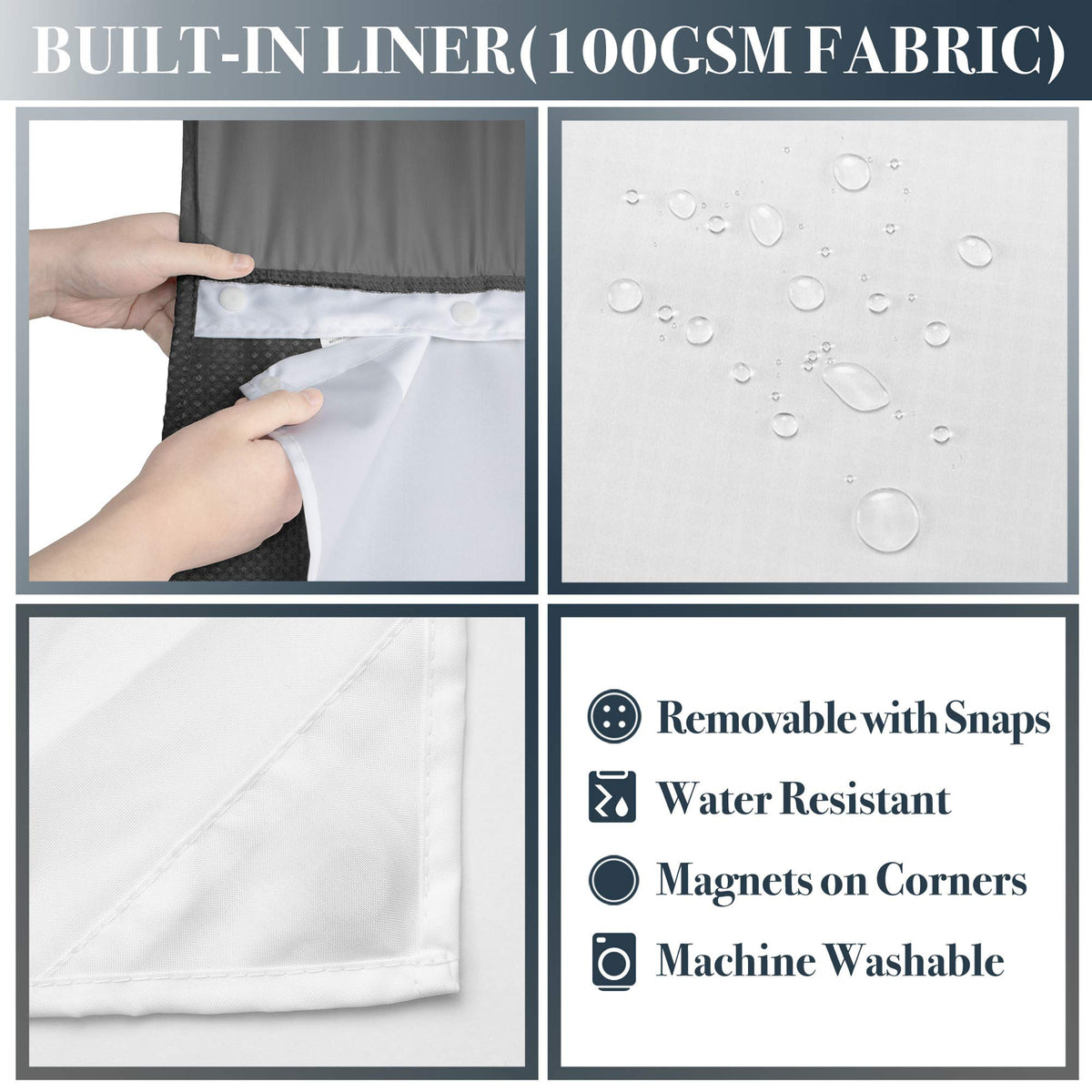 - Q: What is the purpose of the snap-in fabric liner? A: The snap-in fabric liner provides added protection against water, is easy to remove for cleaning, and enhances the overall aesthetic of the shower curtain.