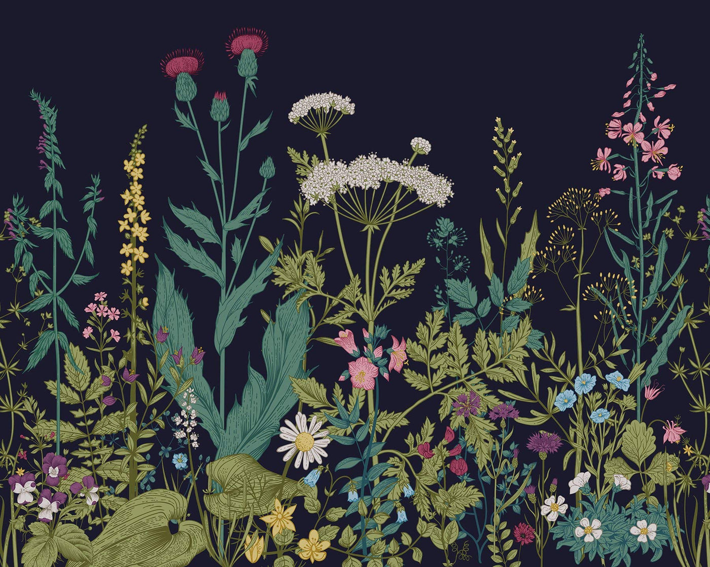 • Q: What design style does this mural fit into? A: The Botanical Fleur wall mural fits into a vintage floral design style, featuring vibrant shades of teal, pink, purple, and green.