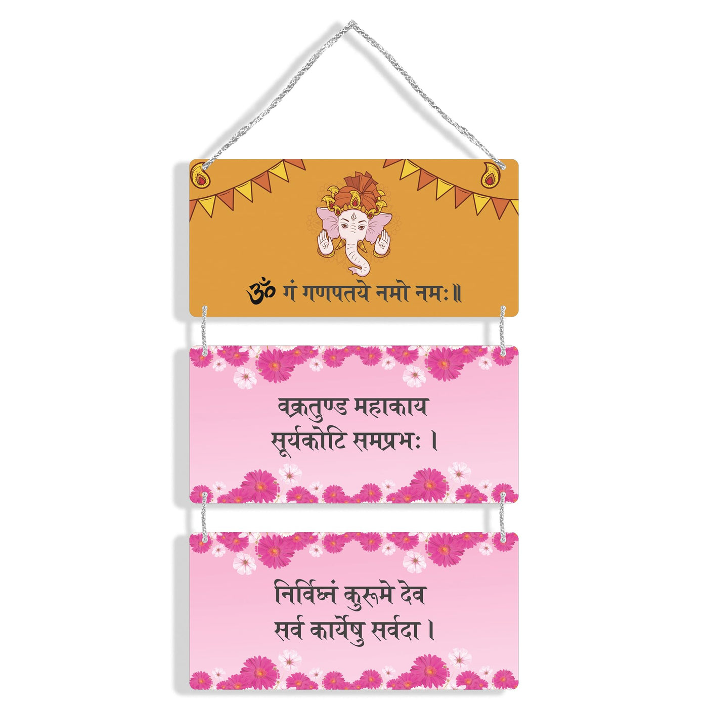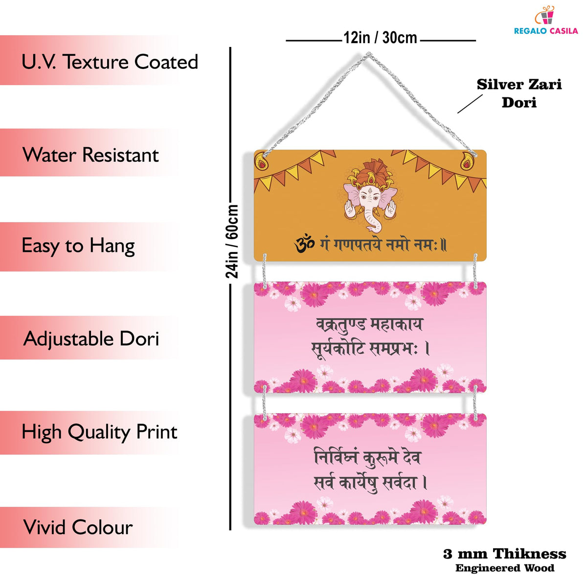 Regalocasila Beautiful Wooden Wall Hanging With Om Gan Ganpataye Namo Namah Mantra Printed Adjustable Silver Zari Rope