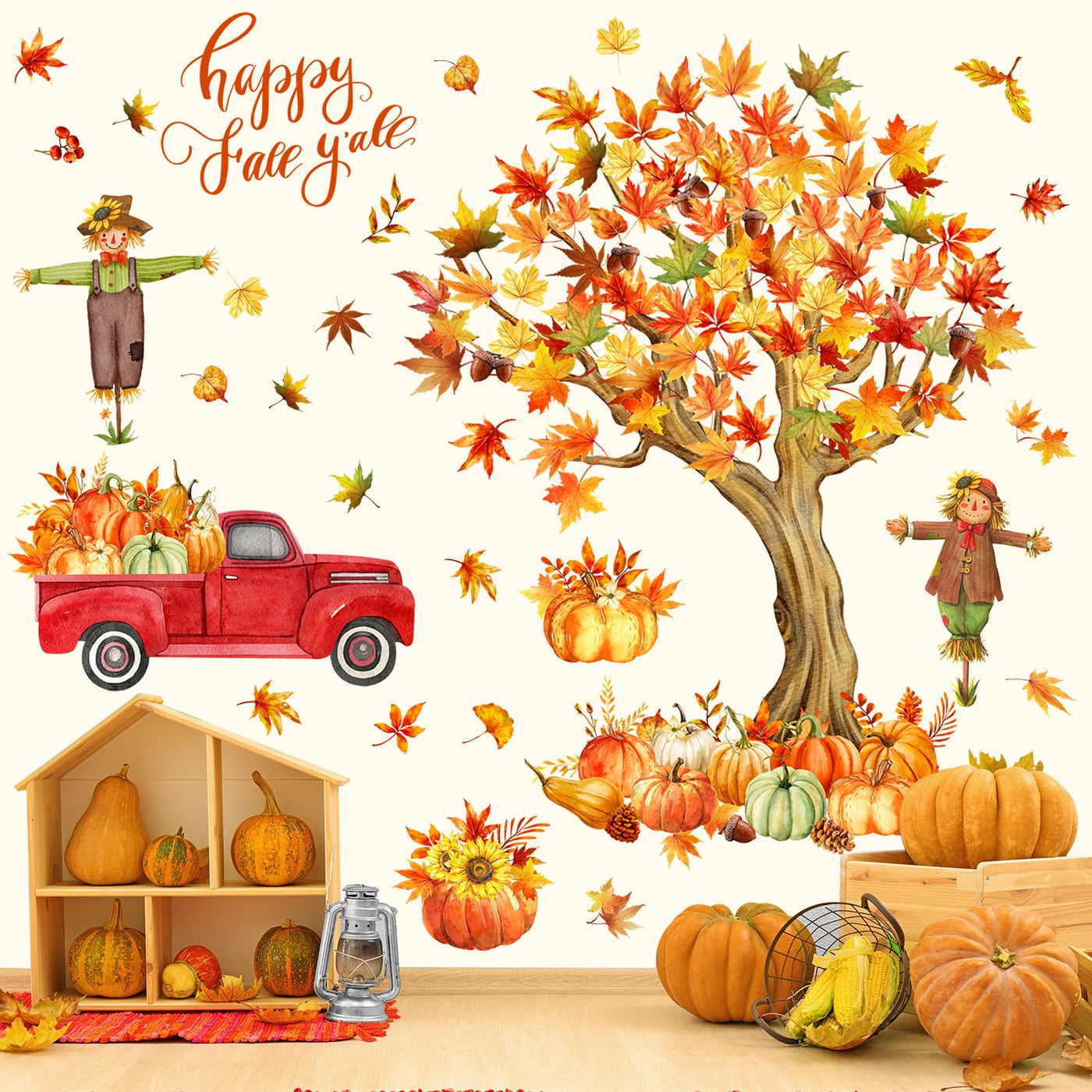 - Q: What themes do the decals feature? A: The decals feature autumn elements such as maple leaves, trees, pumpkins, scarecrows, and trucks, creating a cozy fall atmosphere.