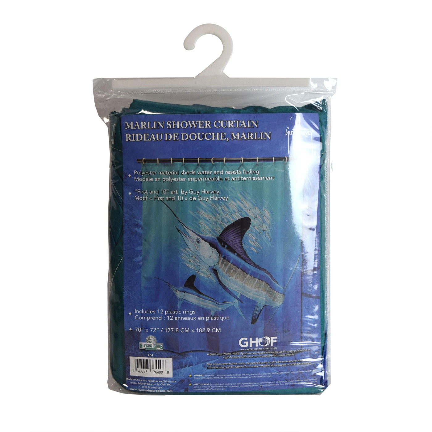 - Q: What design is featured on the shower curtain? A: The shower curtain features captivating artwork by Guy Harvey, specifically the First and 10 design, showcasing beautiful marine life.