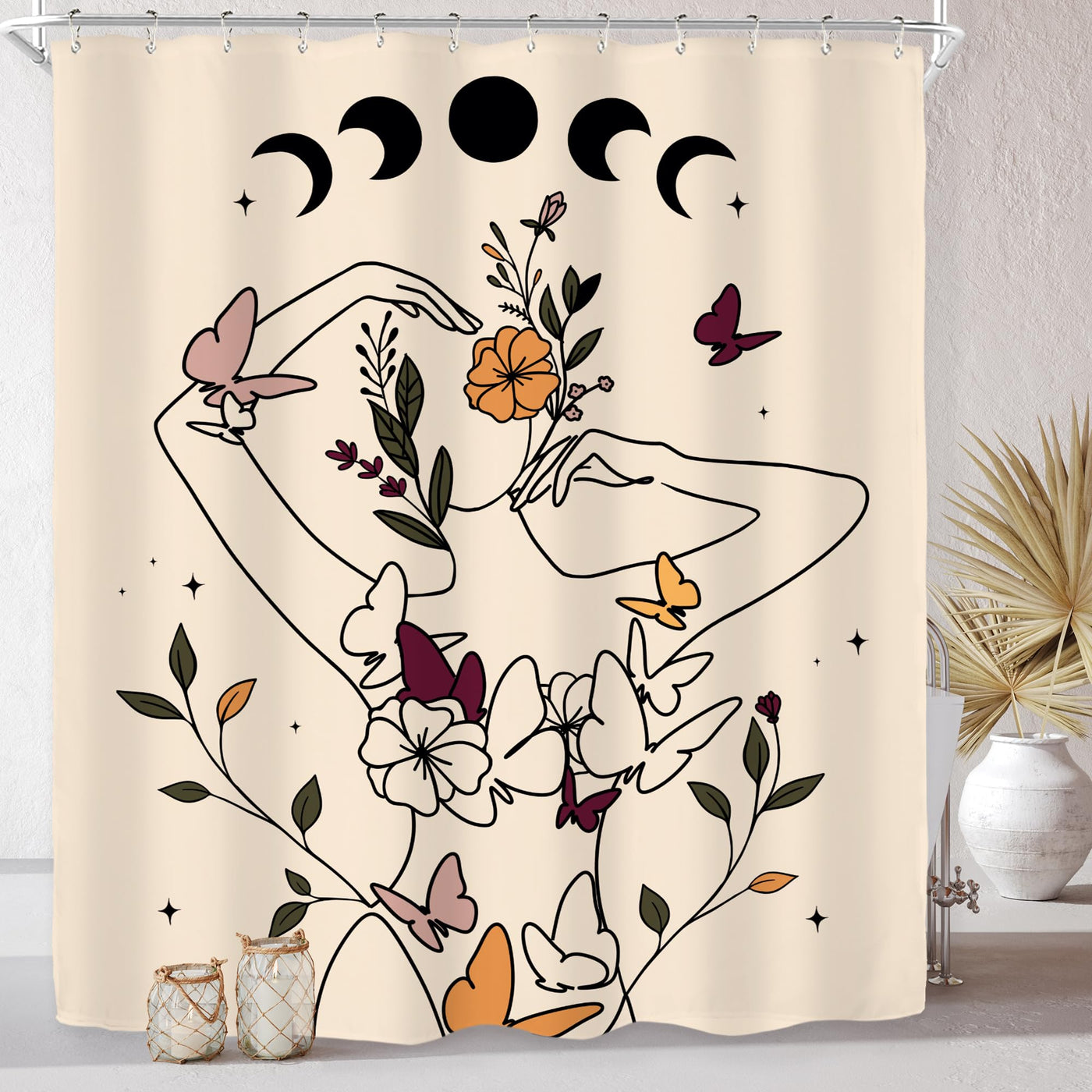 Riyidecor Abstract Woman Art Line Moon Phase Shower Curtain For Bathroom Decor 60Wx72H Floral Butterfly Body Modern Aesthetic Mi