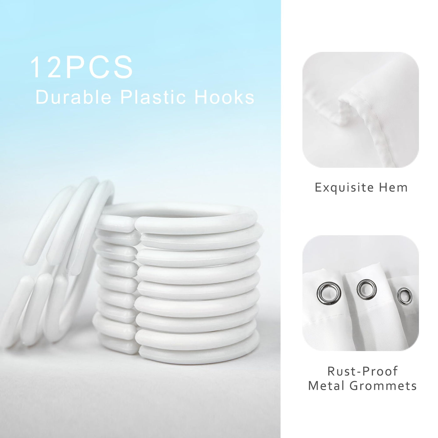 • Q: Does the shower curtain come with hooks? A: Yes, the shower curtain comes with a 12-pack of plastic shower hooks included.