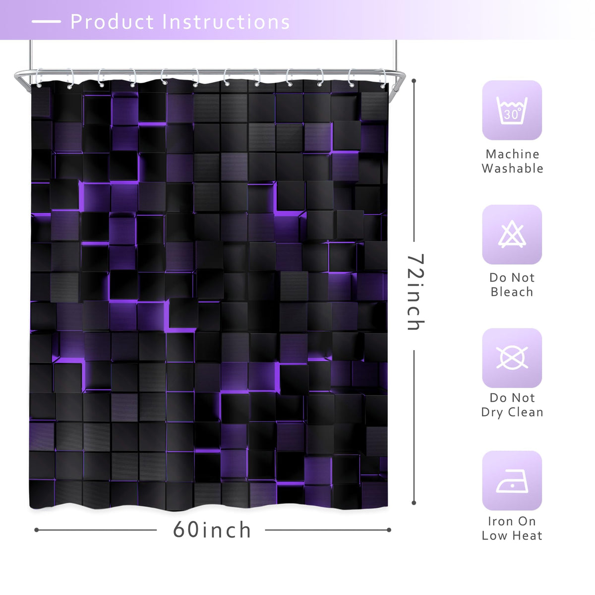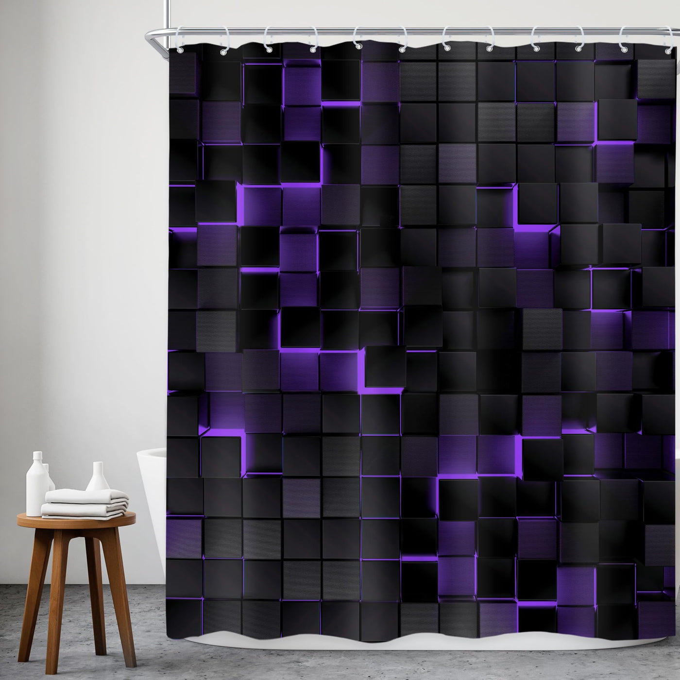 Riyidecor Black Purple Wall Shower Curtain 60Wx72H Inch Abstract Brick Modern 3D Gradient Design Futuristic Geometric Plaid Cube