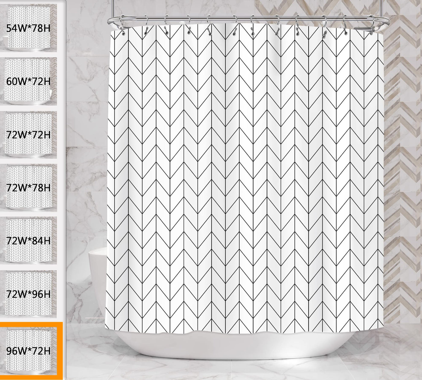 - Q: What design does the shower curtain feature? A: The shower curtain features a classy geometric theme with a black and white chevron pattern, adding a modern touch to your bathroom decor.