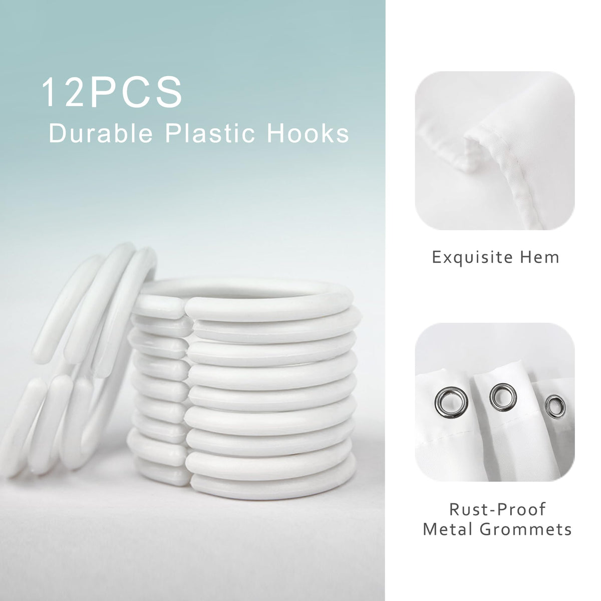 • Q: Does the shower curtain come with hooks? A: Yes, the shower curtain includes a 12-pack of plastic shower hooks.