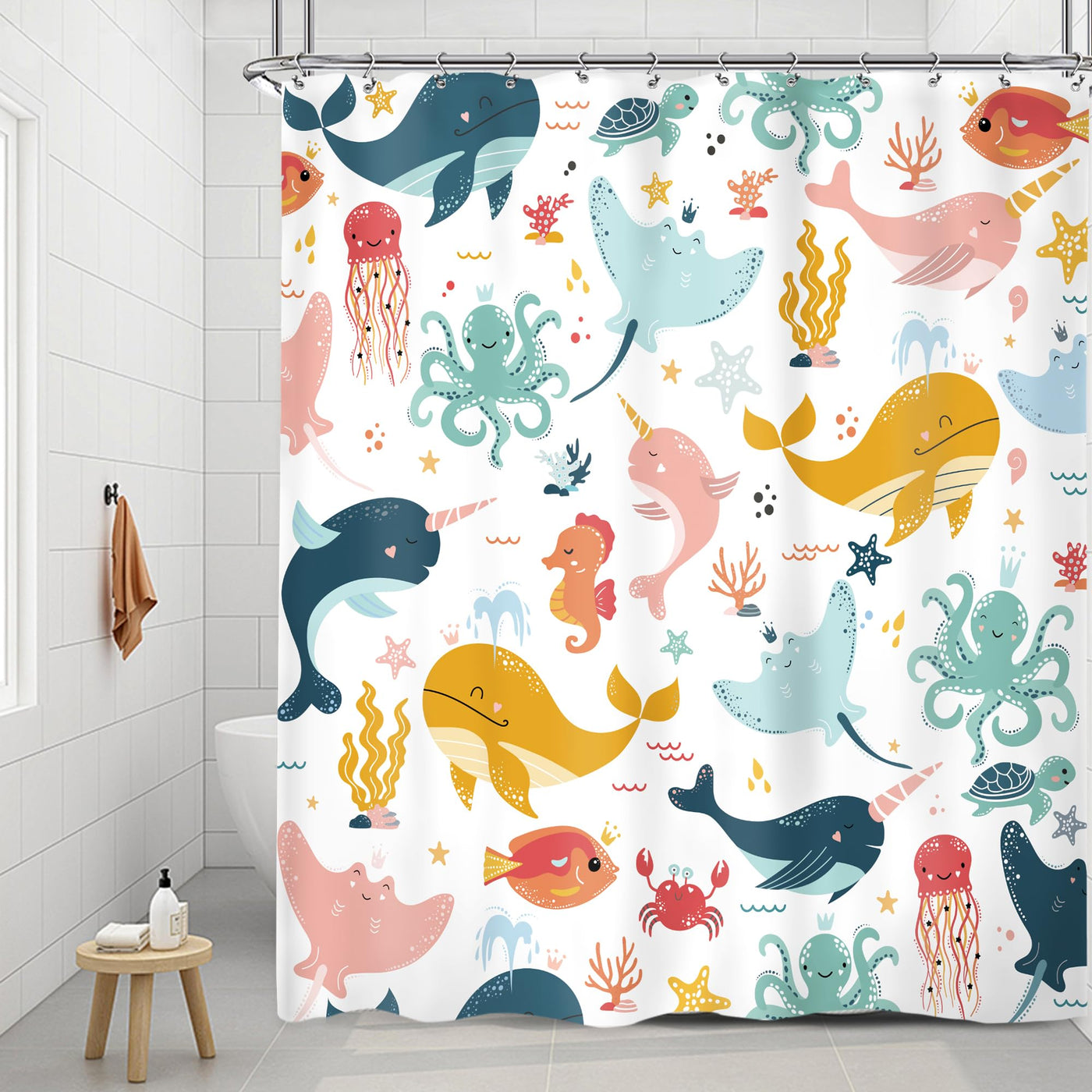 • Q: What is the design theme of the shower curtain? A: The design features a cute marine animal theme with a funny whale pattern.