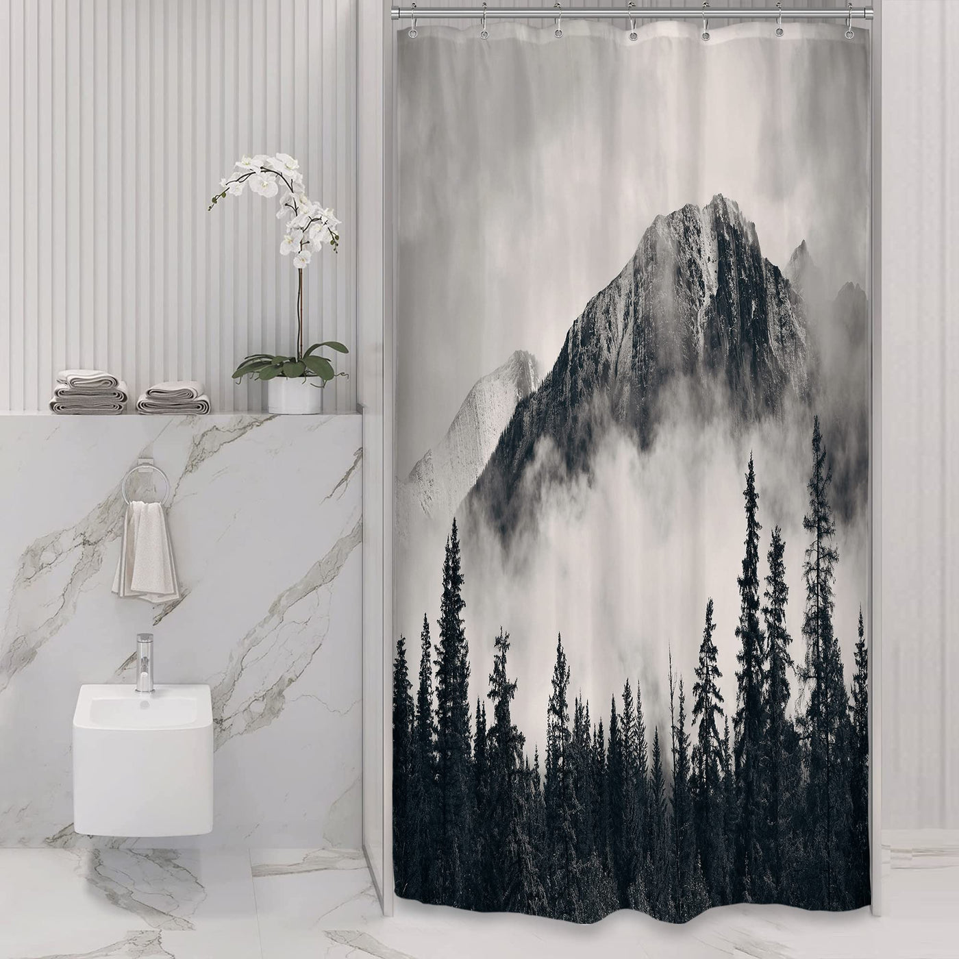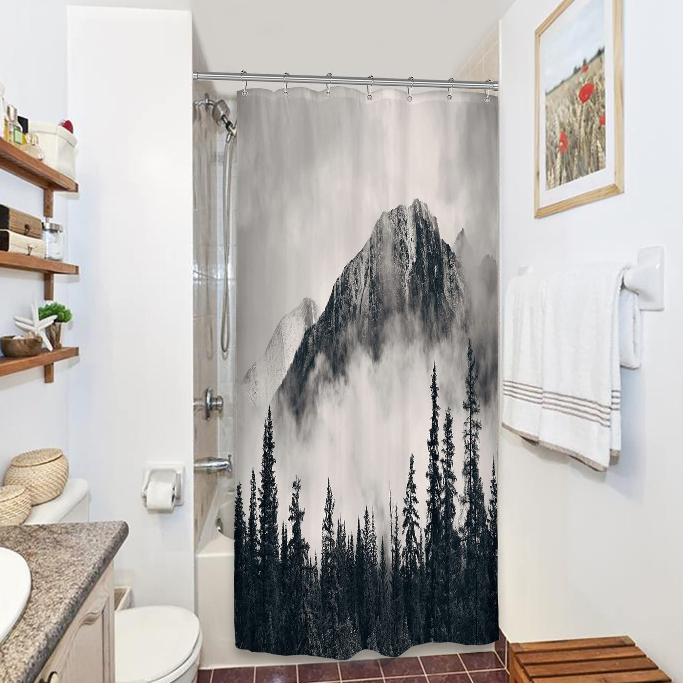 - Q: What is the design theme of the shower curtain? A: The design features a white mountain theme with a mountain and tree pattern in cool and modern white and black colors.