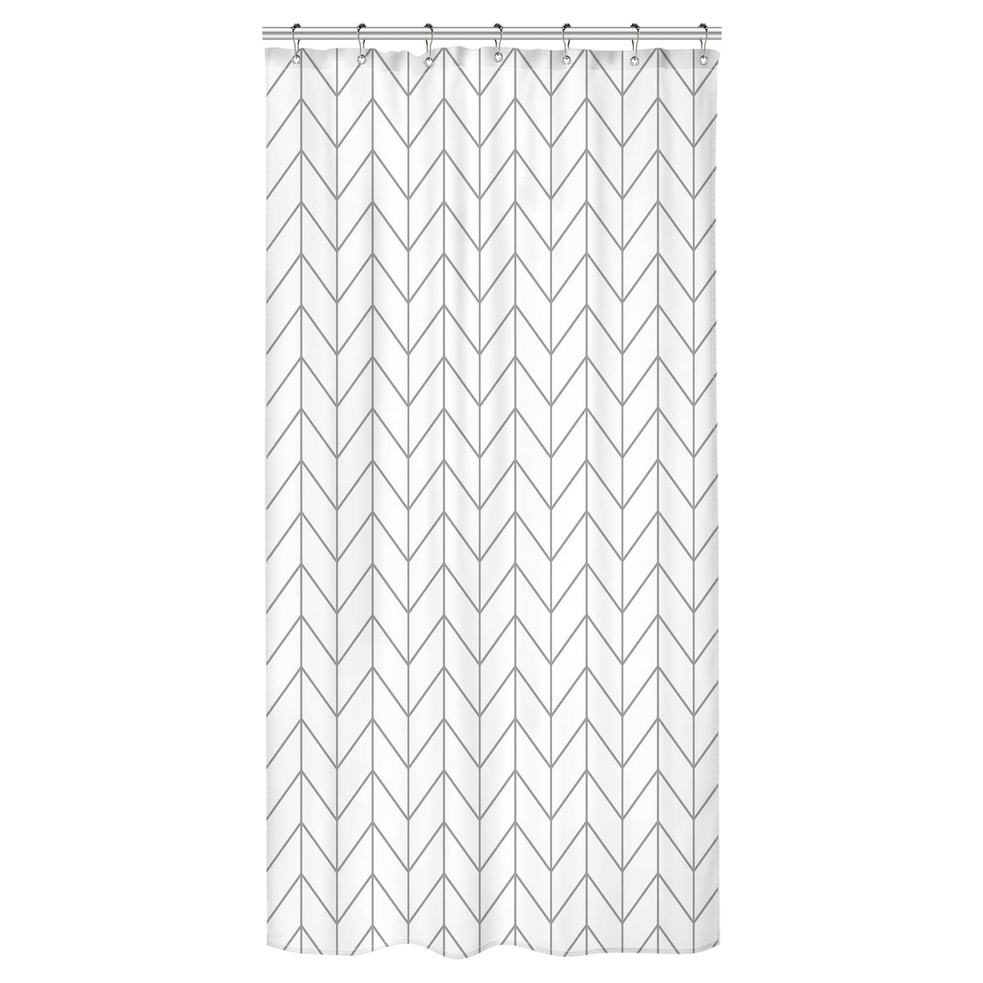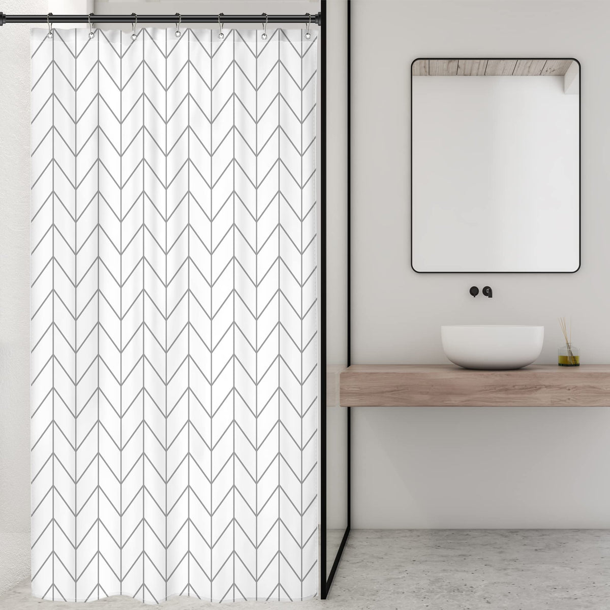 - Q: What is the design of the shower curtain? A: The shower curtain features a modern geometric theme with a chevron pattern in white and grey colors.