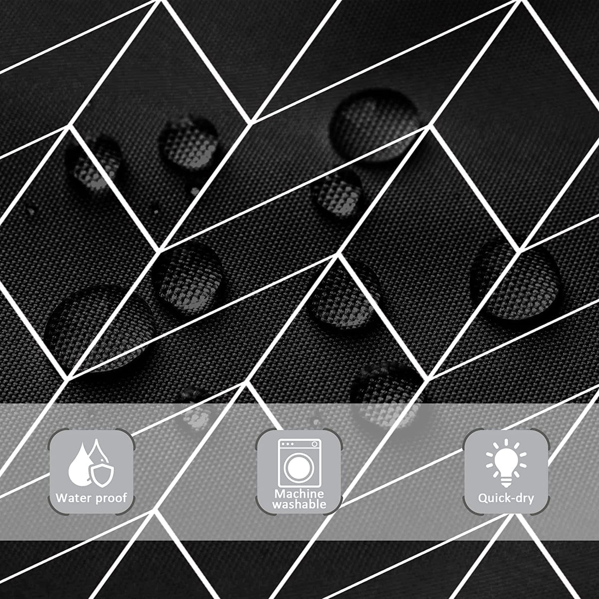 - Q: What pattern does the shower curtain feature? A: The shower curtain features a geometric chevron pattern in black.