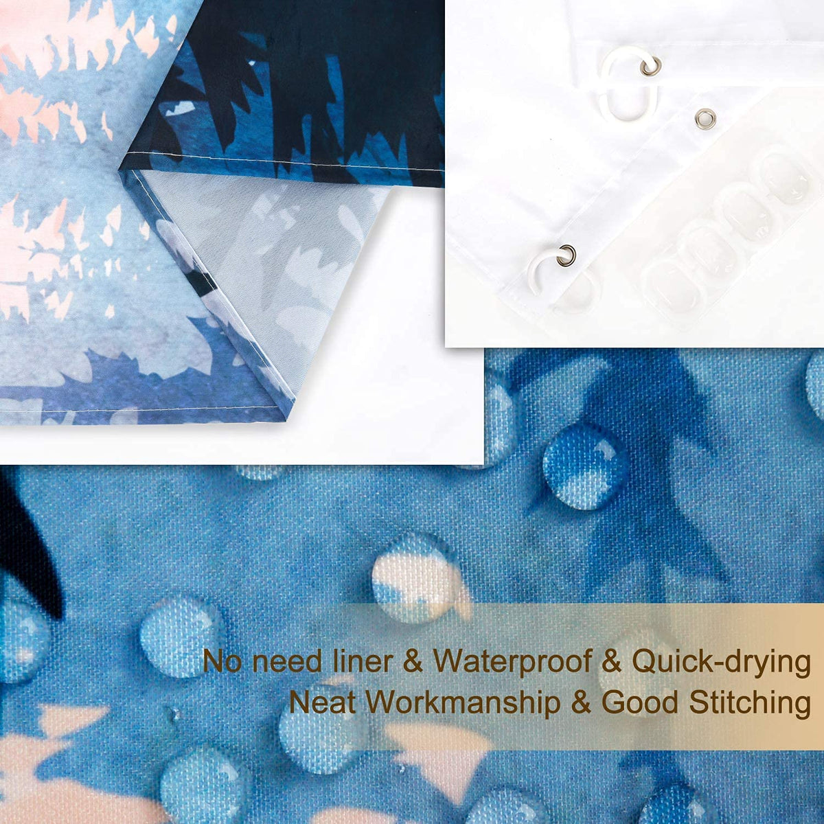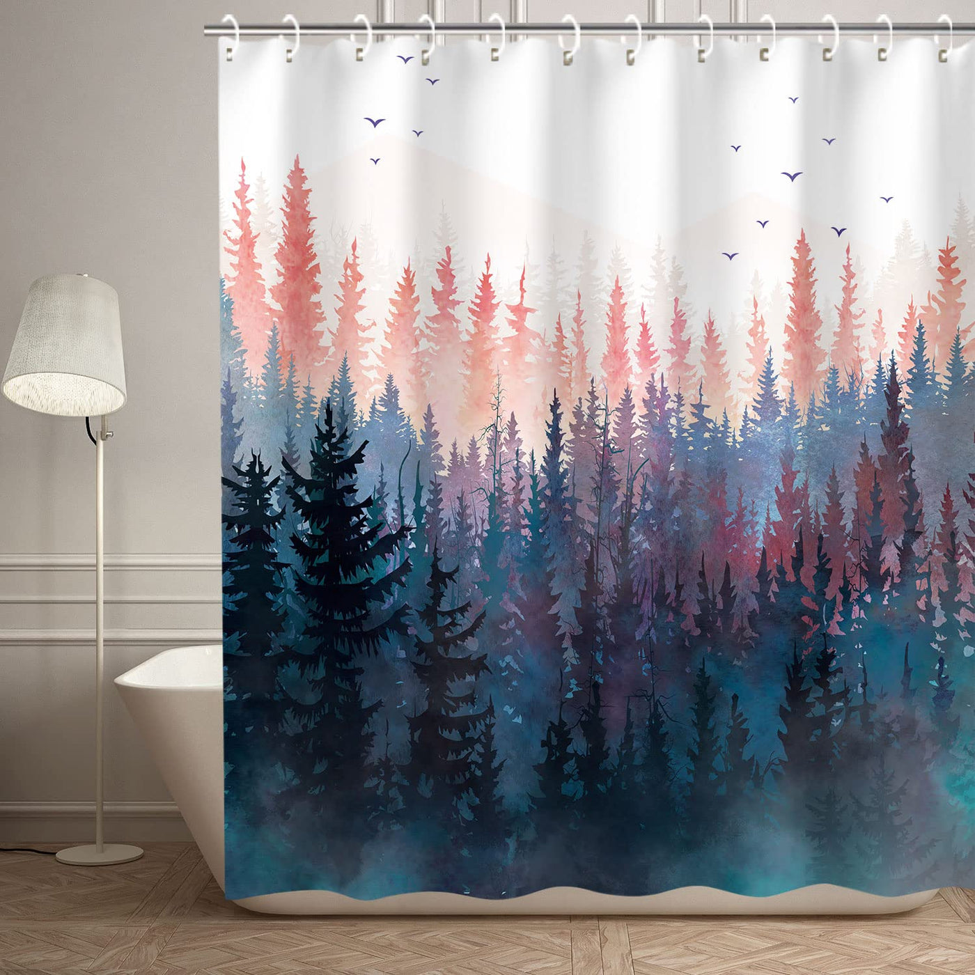 - Q: What design does the shower curtain feature? A: The shower curtain features a creative and unique pattern of pink and blue foggy mountains, trees, a moon, and birds, suitable for various bathroom styles.