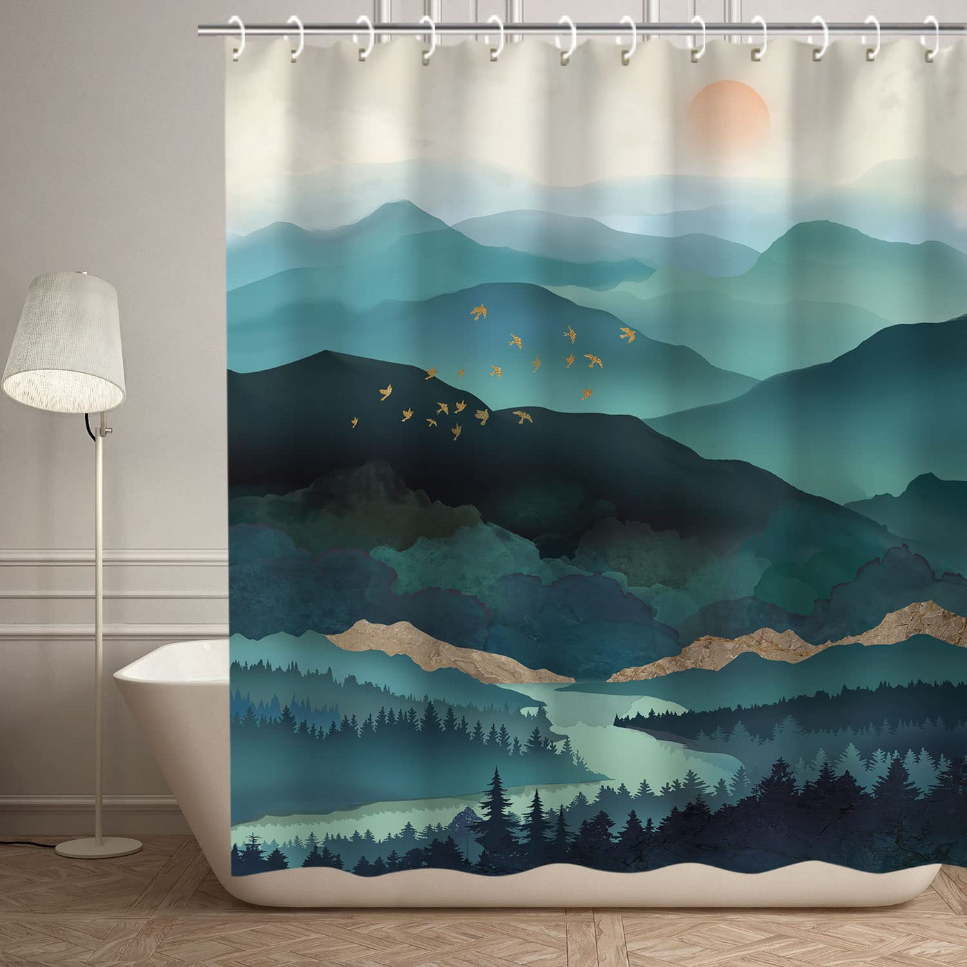 • Q: What type of decor does the shower curtain match? A: The teal color and watercolor nature print of the shower curtain make it suitable for a wide range of bathroom decors, enhancing the aesthetic with its unique mountain patterns.