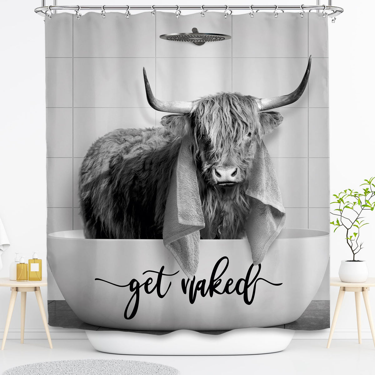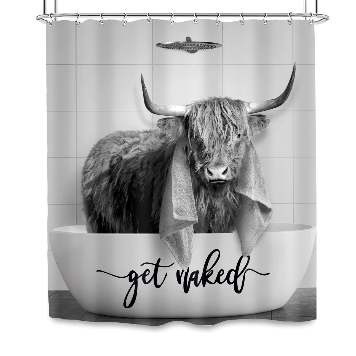 - Q: What is the design of the shower curtain? A: The shower curtain features a contemporary highland cow design with muted tones of gray and white, adding a rustic touch to your bathroom.